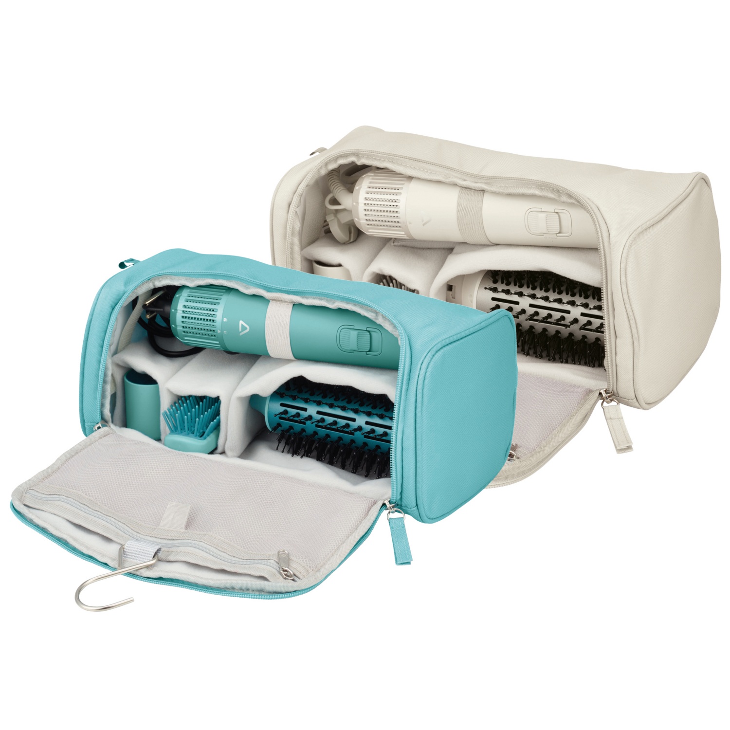- 5 in 1, Stylingbürste, Föhnbürste, Haartrockner, und 2 Lockenstäbe für links und rechts separat