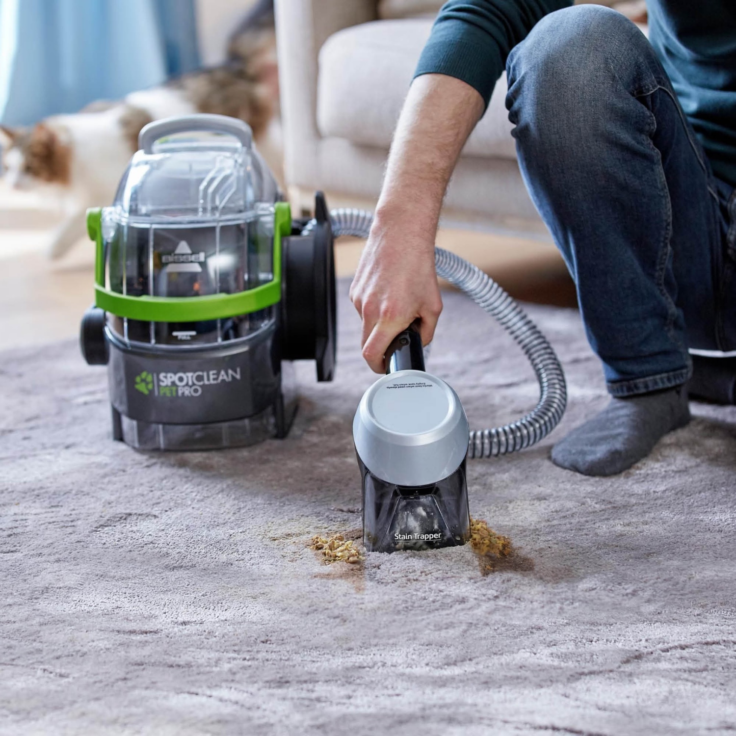 - Der BISSELL SpotClean Pet Pro hilft, mit Wasser, BISSELL-Lösung und Handreinigungsgeräten mit starker Saugkraft Flecken von fast jeder Teppichoberfläche zu entfernen. Von stark frequentierten Bereichen und Treppen bis hin zu Polstern, Autoinnenräumen und vielem mehr. Das Stain Trapper Tool sprüht, schrubbt und saugt extra grobe, extra stinkende Verschmutzungen. Verschmutzungen werden gesammelt und in einem separaten, abnehmbaren Behälter aufbewahrt, der sich zum einfachen Entleeren und Entsorgen abdrehen lässt. Dieses einzigartige Werkzeug hält Haustier- und andere flüssige Verschmutzungen im Werkzeug und aus Ihrer Maschine heraus. Mit dem BISSELL SpotClean Pet Pro haben Sie endlich die Möglichkeit, die Flecken Ihres Haustieres schnell zu entfernen.