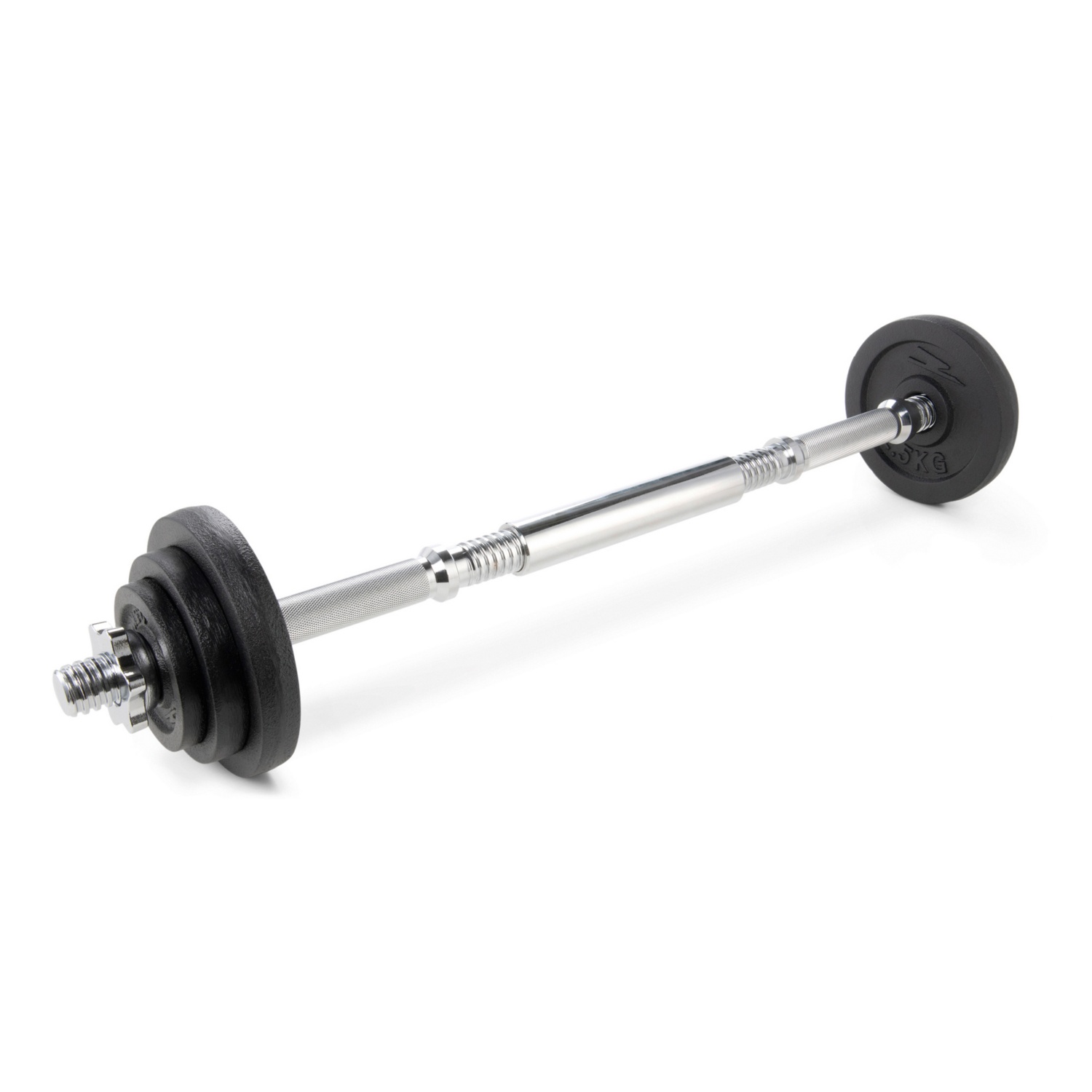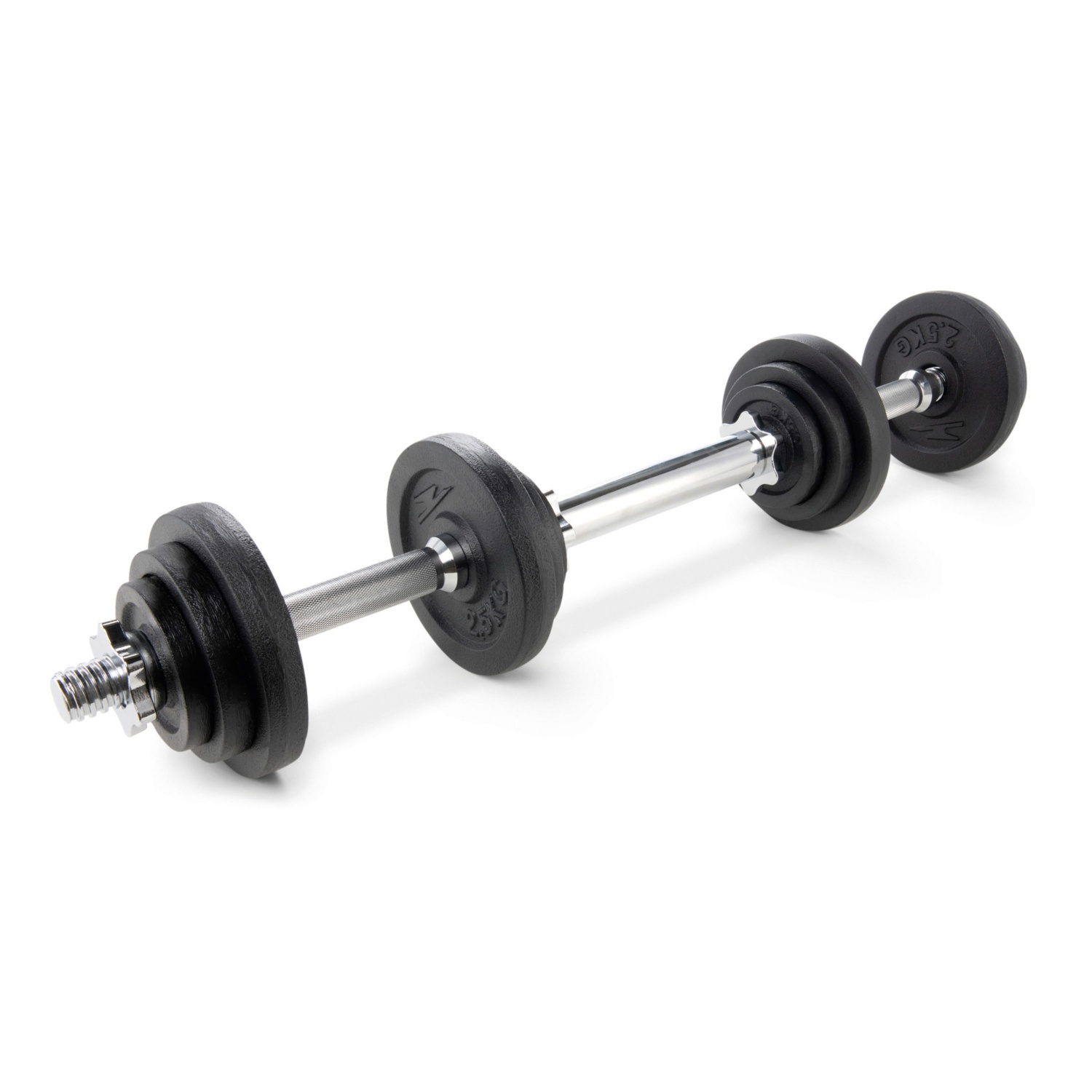 - 2 Kurzhanteln können zu einer Langhantel zusammengeschraubt werden