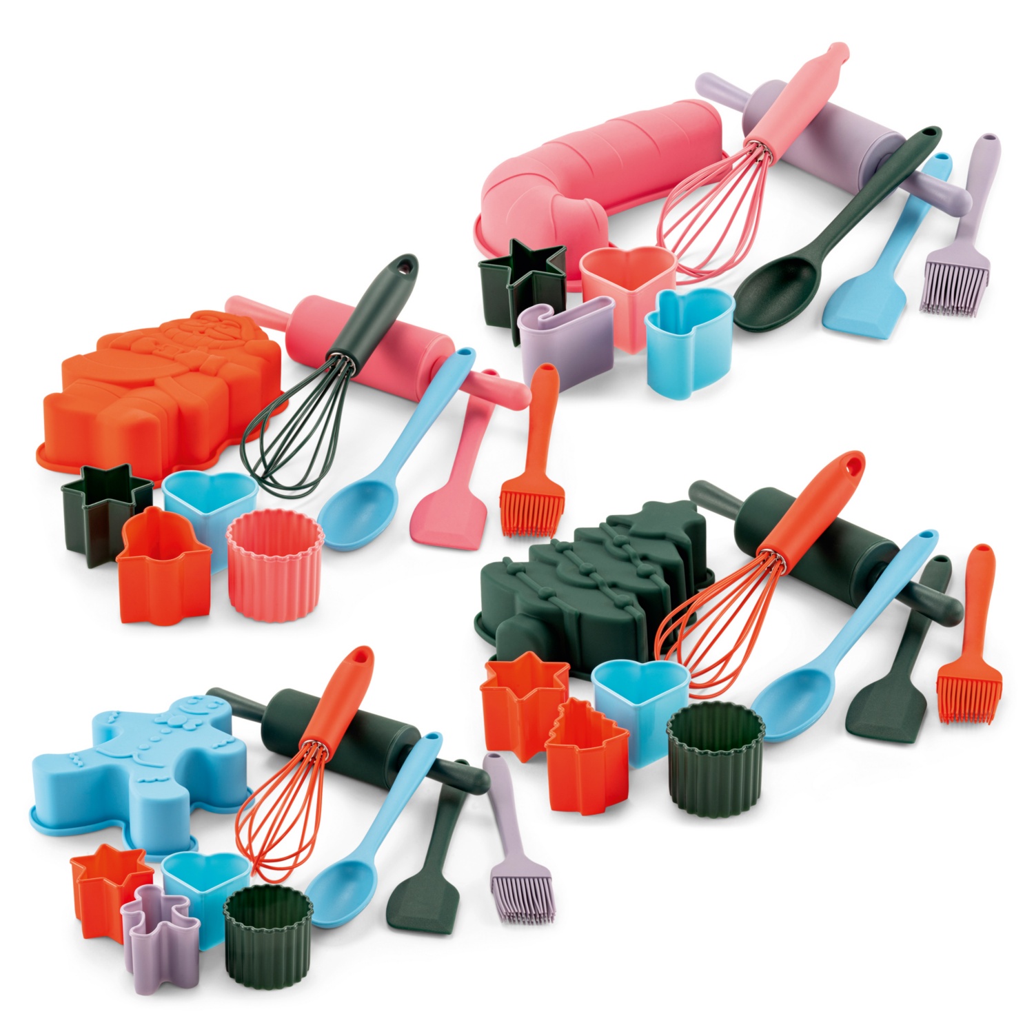 - bestehend aus je einer Silikonbackform, vier Keksausstechern, einem Teigroller, einem Schneebesen, einem Teigspachtel, einem Löffel und einem Pinsel.