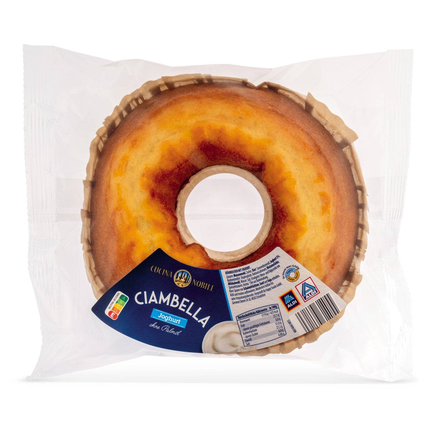 Zutaten:WEIZENMEHL, Zucker, EIER, Sonnenblumenöl, JOGHURT 8%, Backtriebmittel: E450, E500, WEIZENSTÄRKE, fettarmes Kakaopulver 1%, MILCHPROTEINE, Wasser, Salz, Emulgator: E471, Aroma.