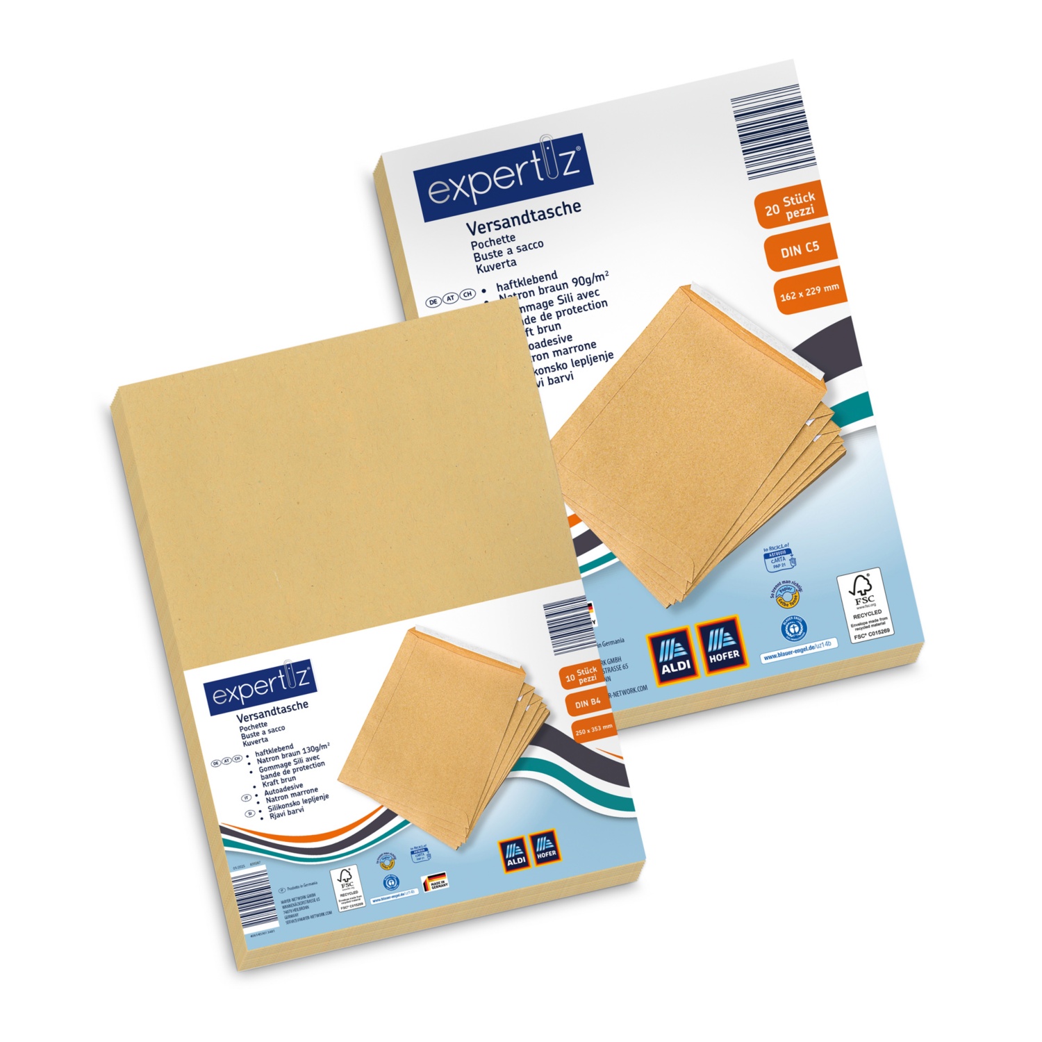 - Versandtasche C5 162x229mm, Haftklebung, Natron braun 90g/qm, FSC Recycled + Blauer Engel zertifiziert, im Consumer-Pack zu 20 Stück eingeschweisst