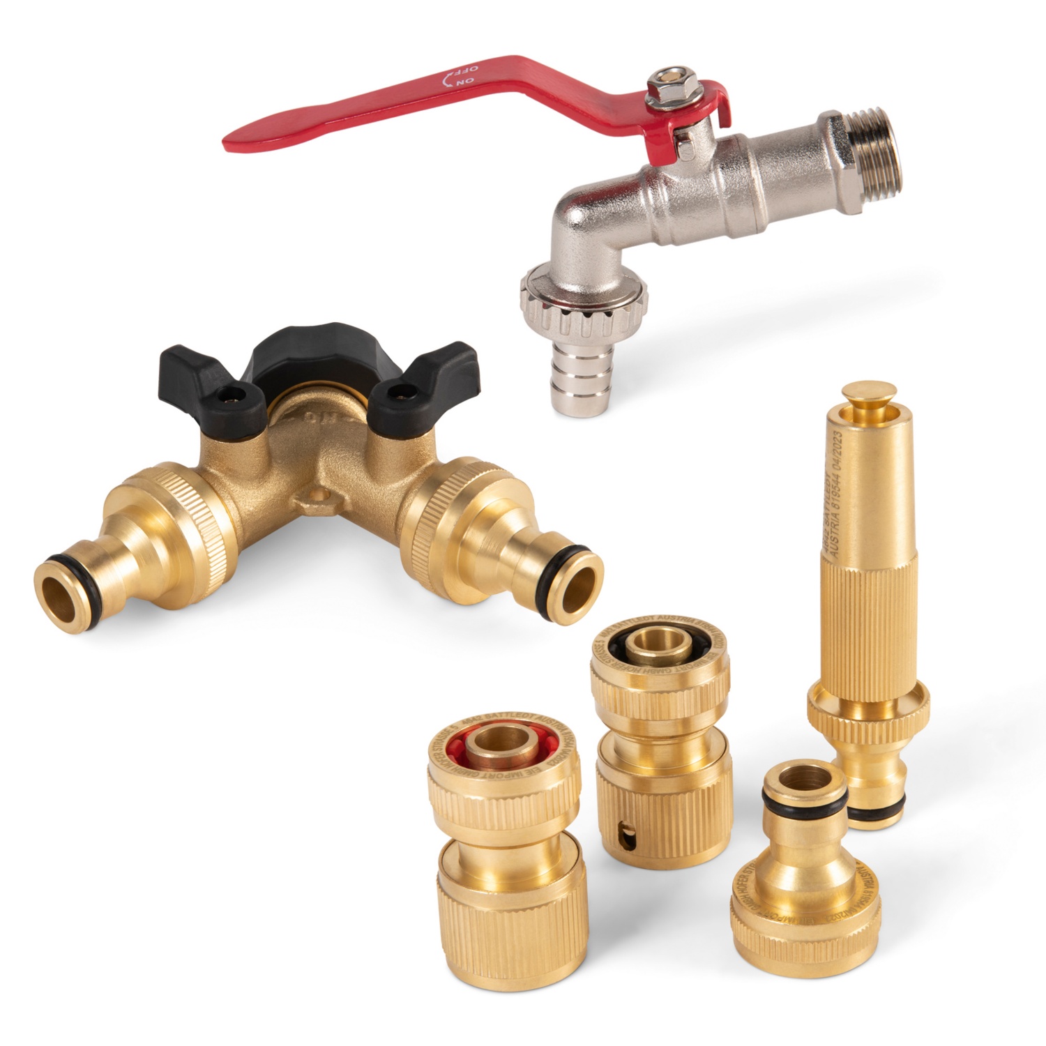 - Messing-Starter-Set, 4-teilig: Hahnstück ¾", 2 Kupplungen (mit und ohne AquaStop) und 1 Sprühpistole,