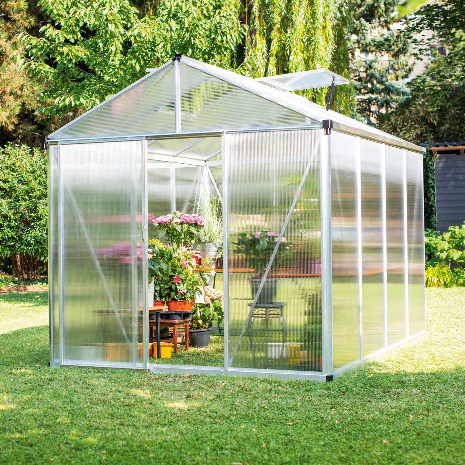 - Verglasung mit UV-stabilden, hagelbeständigen 10-mm-Doppelstegplatten