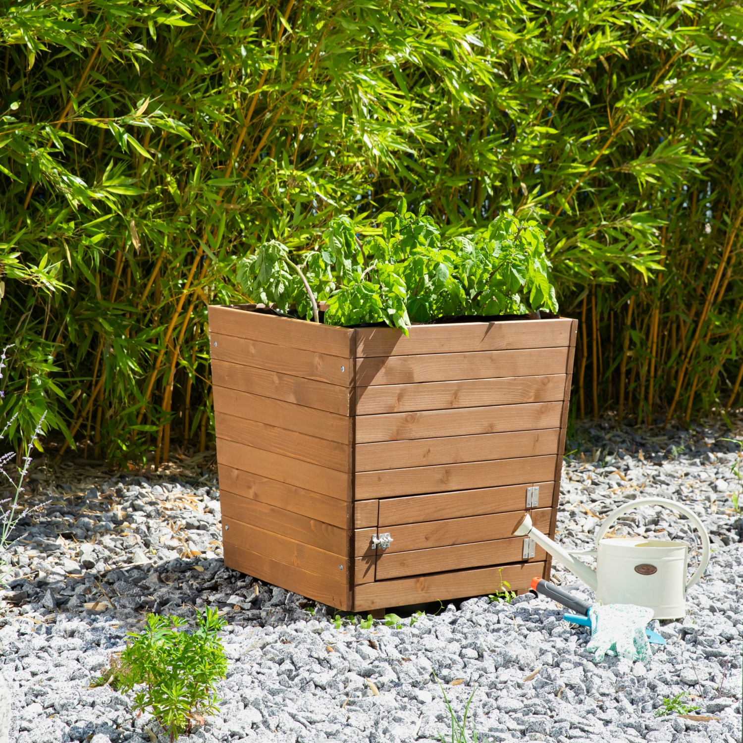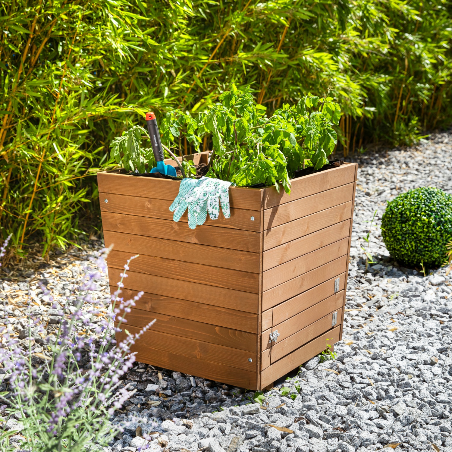 Der Pflanzkasten aus FSC®- zertifiziertem Holz ist mit zwei Türen ausgestattet, um speziell Kartoffeln schnell und einfach zu ernten. Durch die Öffnungen kommt man mit wenigen Handgriffen an das selbstgefplanzte Gemüse, ohne die Pflanze komplett ausgraben zu müssen. Durch die erhöhte Bauweise ist die Pflanze vor Schnecken geschützt.