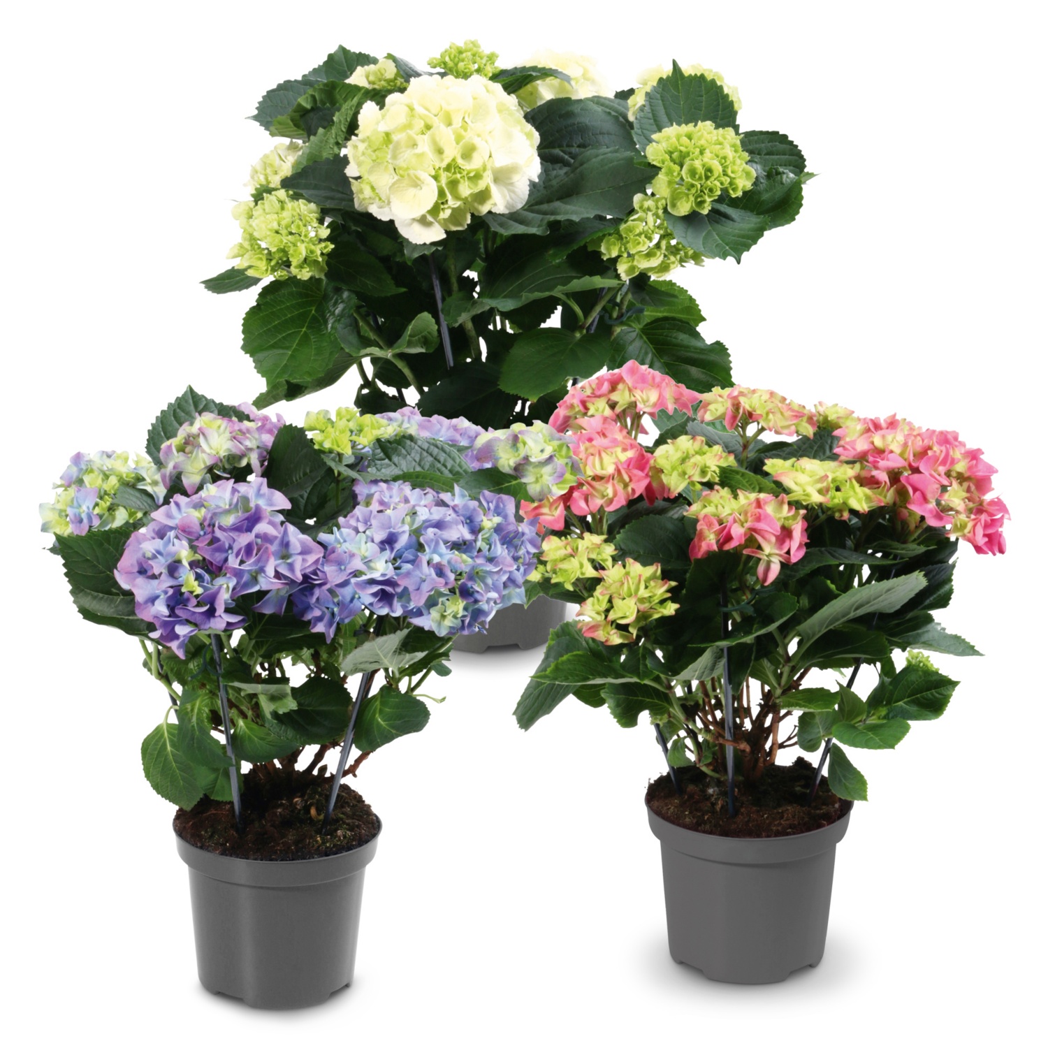 - mit grossen Blütenbällen in den Farben Weiss, Rosa/Rot und Blau/Lila