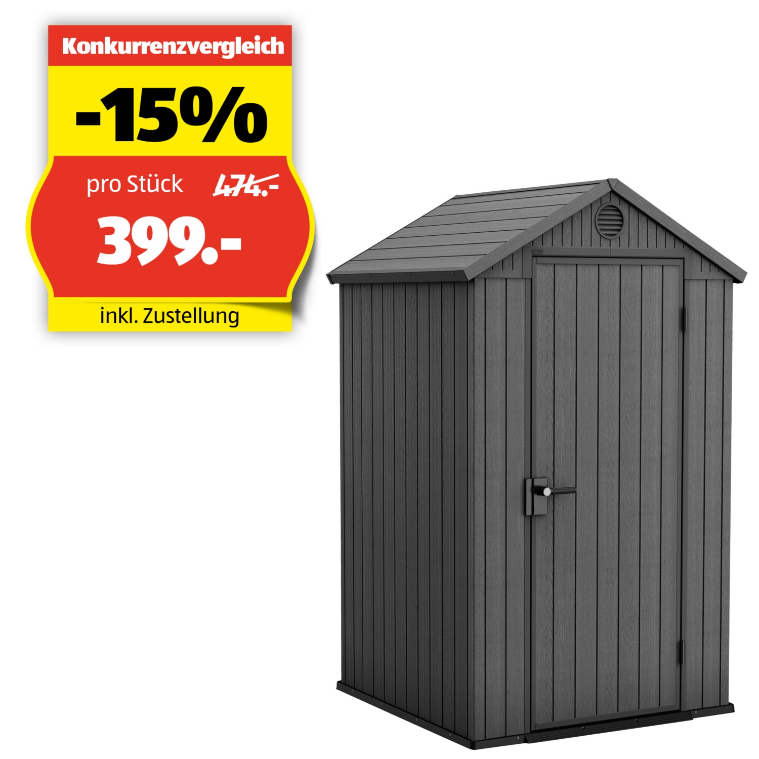 - Gartenhaus in kompakter Grösse. Mit Belüftungslöchern für eine konstante Belüftung, Bodenplatte und Vorrichtung für ein Vorhängeschloss.