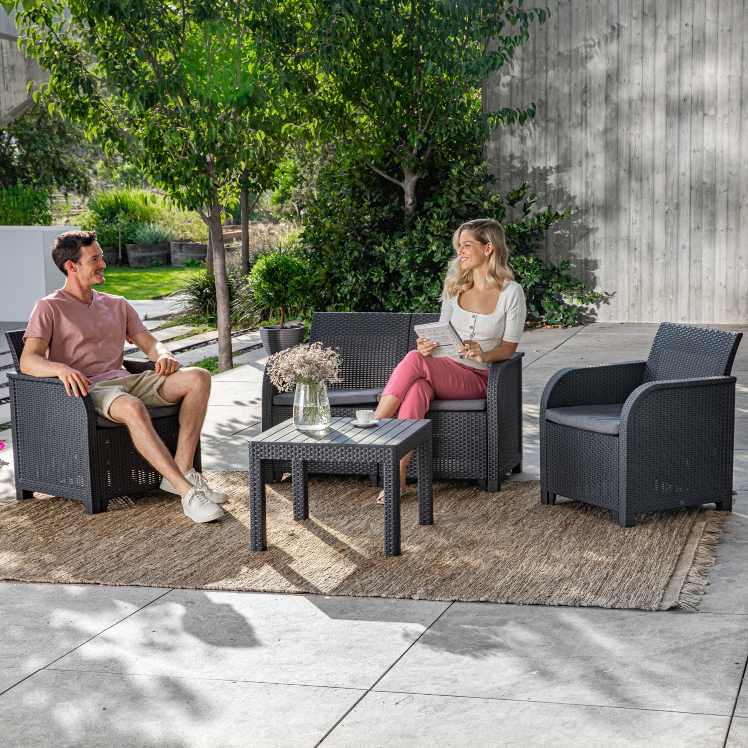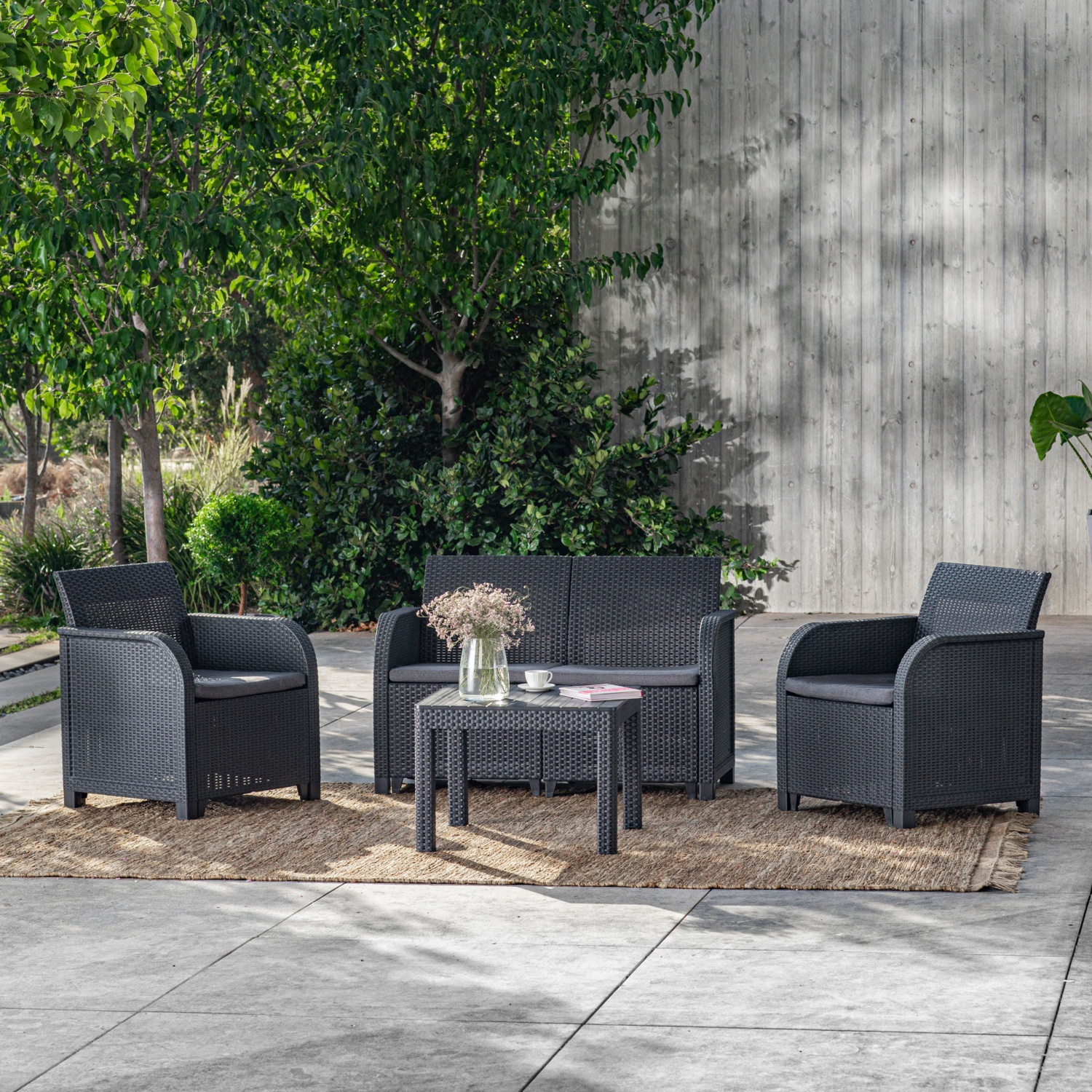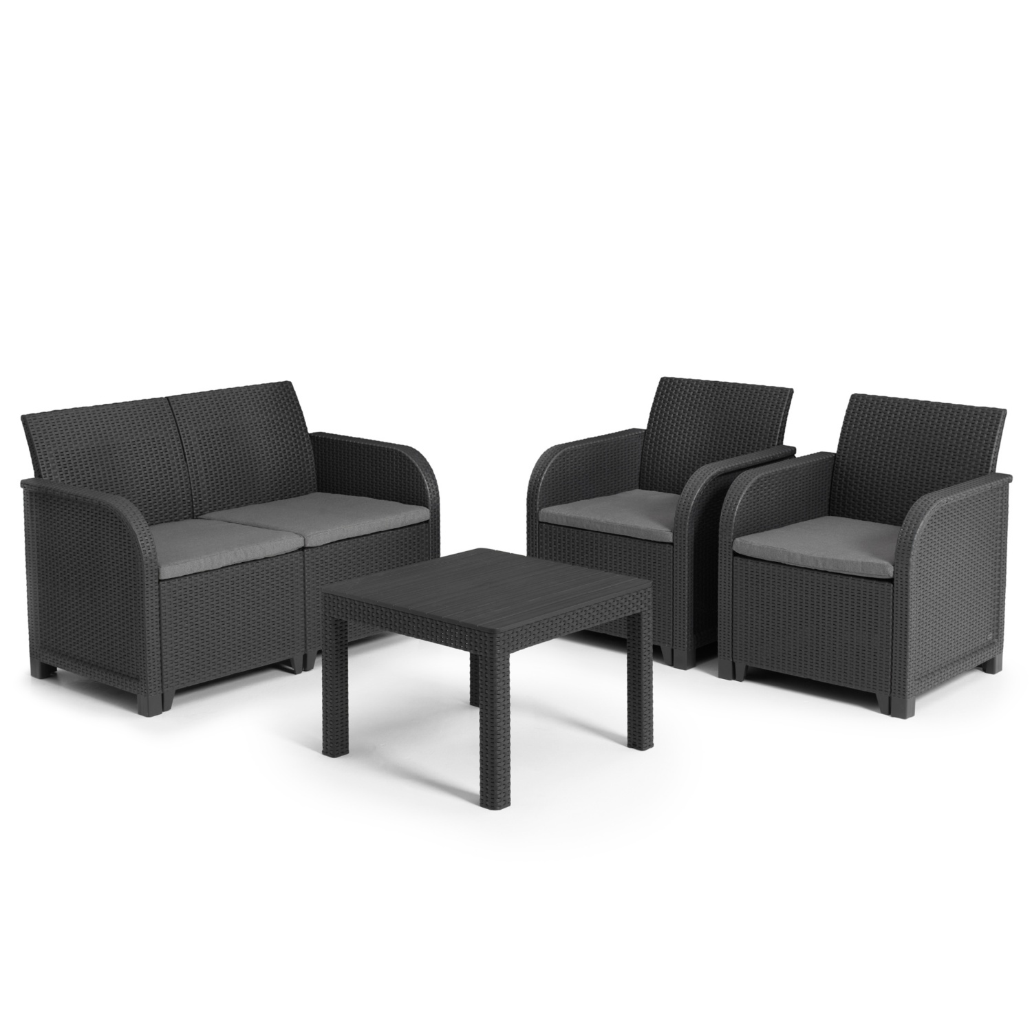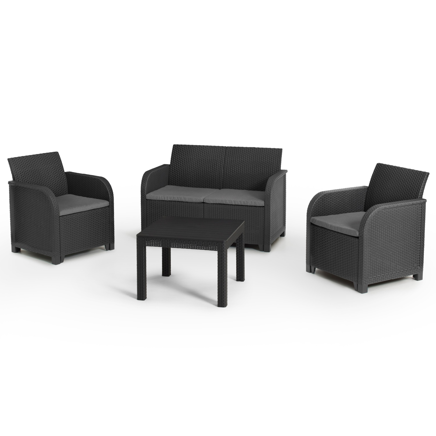 Das Keter Rosalie Loungeset bietet dir mit einem Sofa, zwei Sesseln und einem Tisch in Anthrazit Komfort und Stil für deinen Aussenbereich.