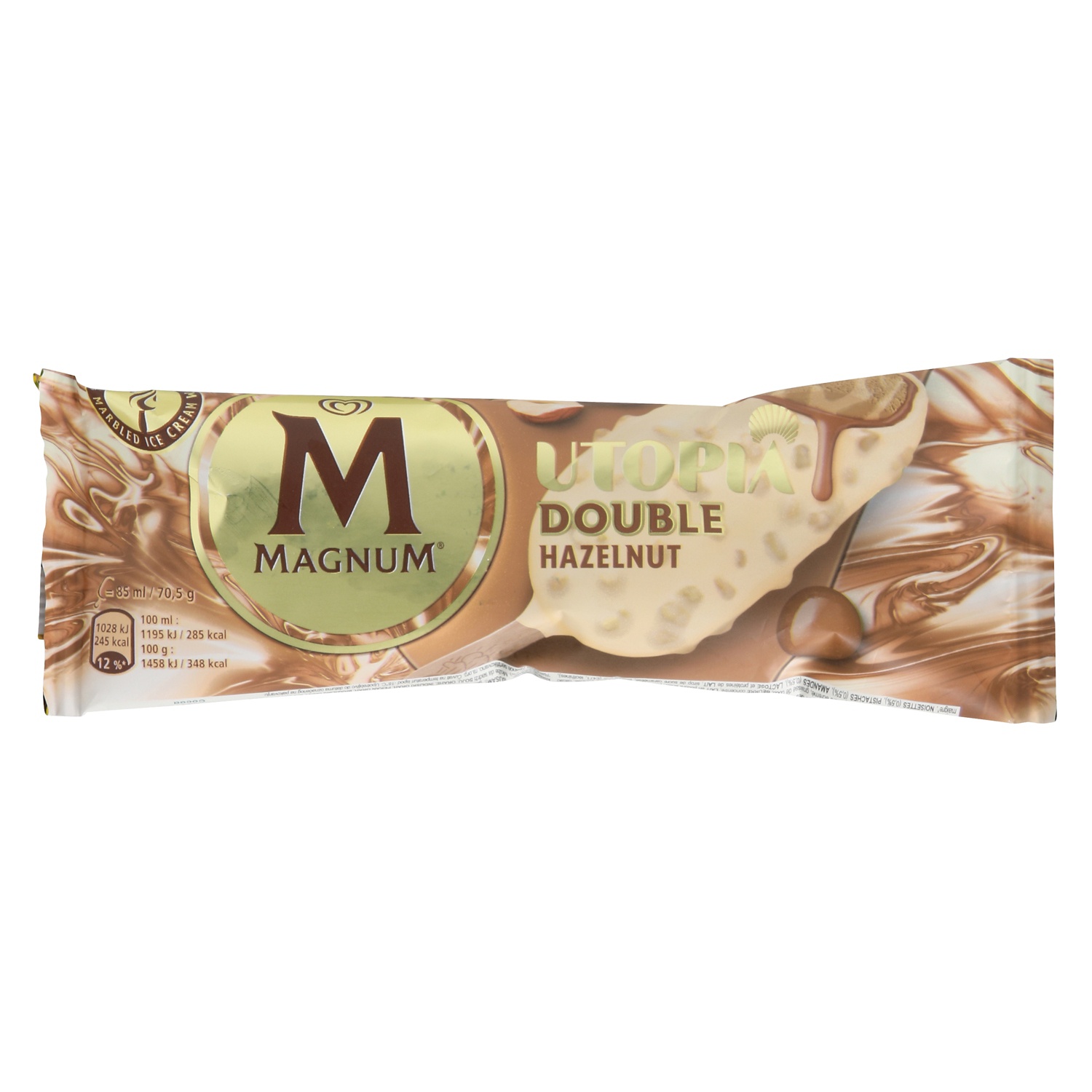Das MAGNUM Double Haselnuss ist ein Glace-Erlebnis der Extraklasse: Zwei Schichten knackige Milchschokolade umhüllen eine feine Haselnuss-Karamell-Sauce und cremiges Haselnussglace. Die Kombination aus zartschmelzender Füllung und intensivem Schokoladengenuss sorgt für einen unwiderstehlichen Moment purer Verwöhnung.