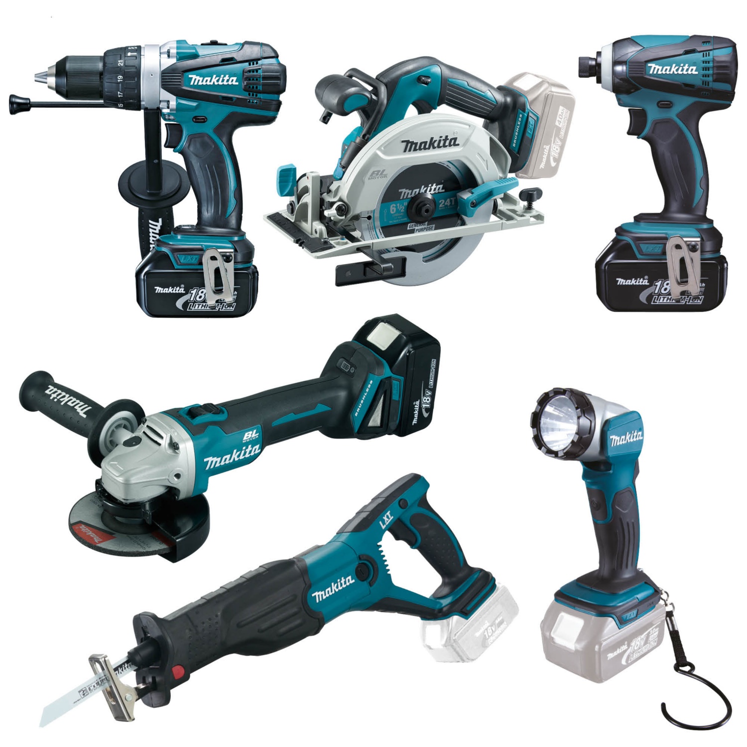 Ein umfangreiches Makita 18 V LXT-Akku Werkzeug Set für den professionellen Einsatz. Enthält den Akku Schlagbohrschrauber DHP458, Akku-Winkelschleifer DGA504, Akku-Handkreissäge DHS680, Akku-Säbelsäge DJR181, Akku-Bitschlagschrauber DTD146 und die Akku-Lampe DML802 Makita Akku-Schlagbohrschrauber: