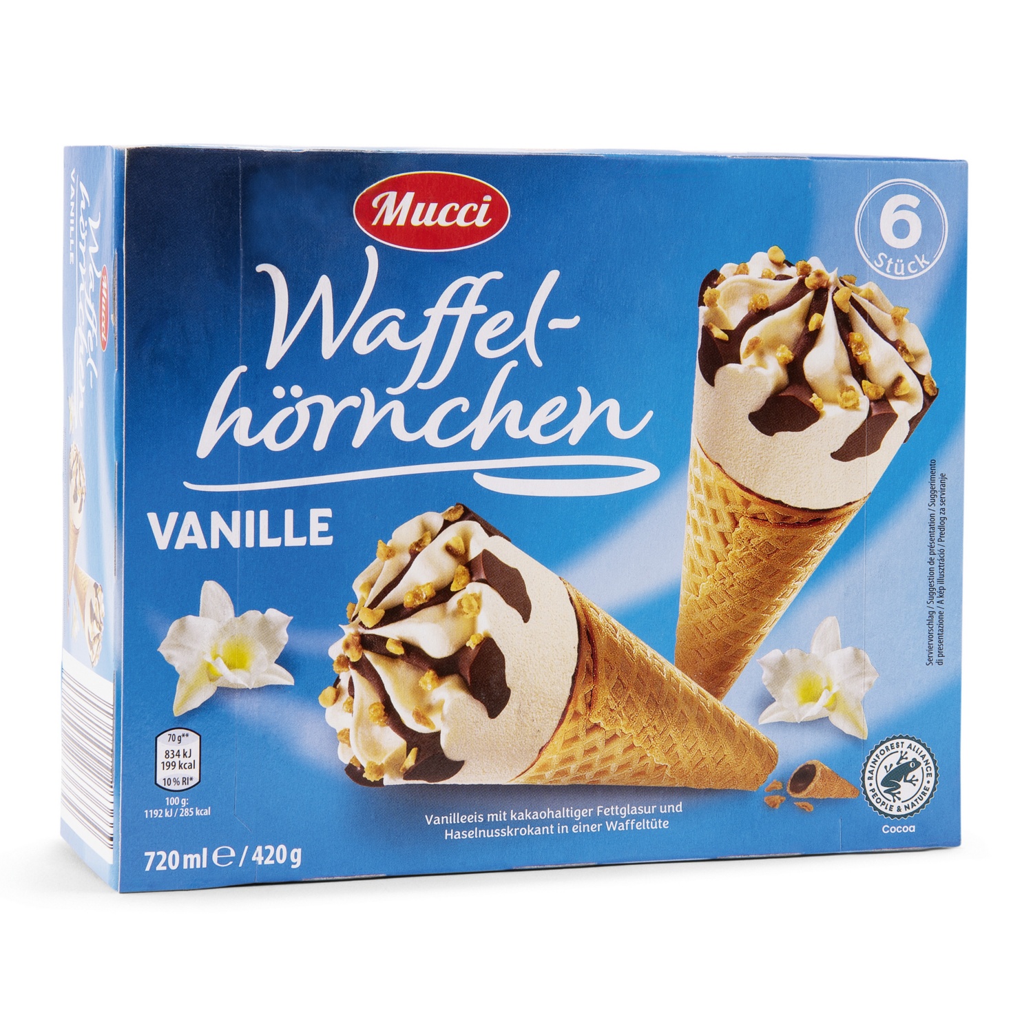 Die MUCCI Waffelhörnchen Vanille bieten cremiges Vanilleglace im knusprig gebackenen Waffelhörnchen – ein zeitloser Klassiker, der Gross und Klein begeistert. Verfeinert mit einer zarten Glasur und Topping, sorgt dieses Glace für echten Sommergenuss bei jedem Bissen.