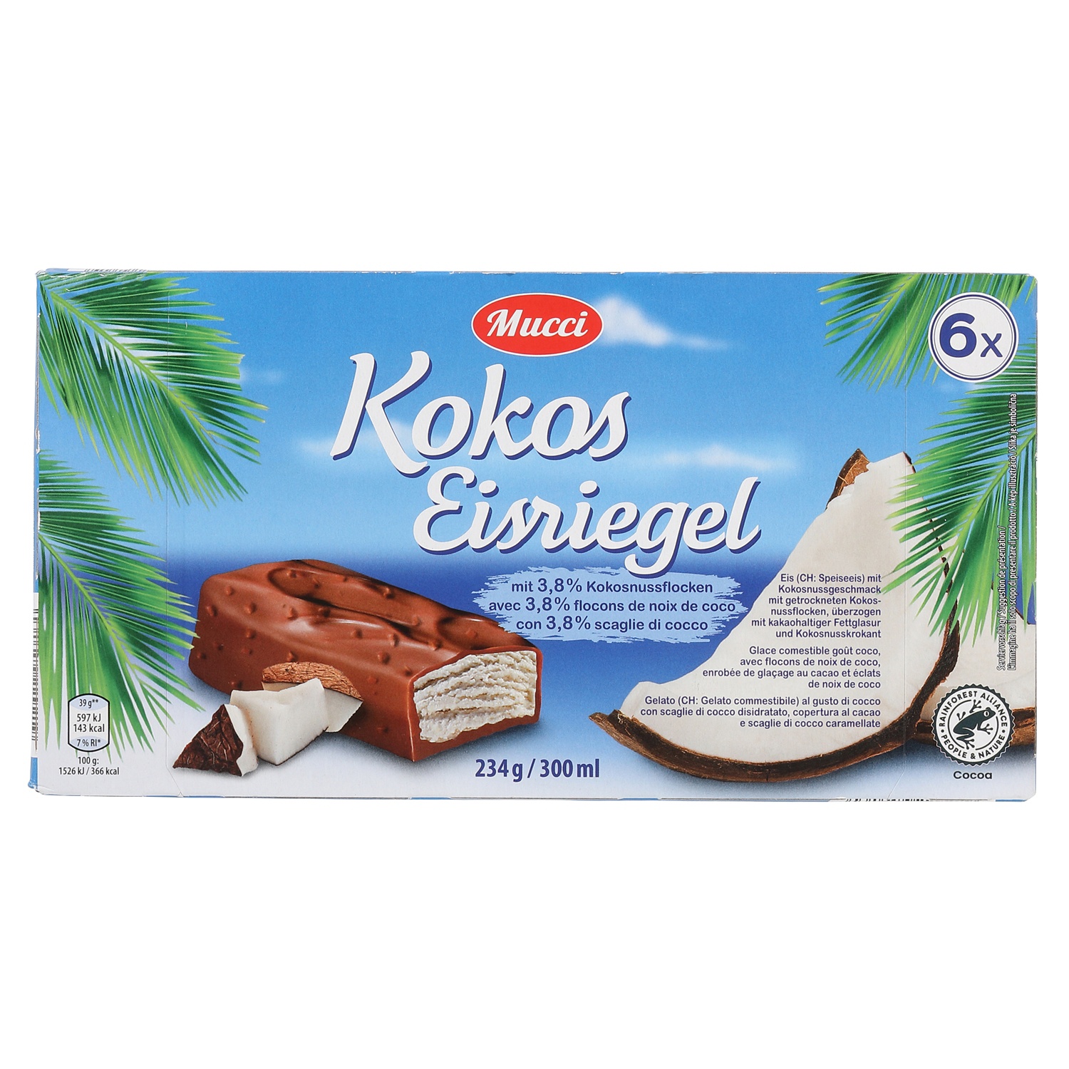 Der MUCCI Eisriegel Kokosnuss bringt tropisches Flair ins Tiefkühlregal. Cremiges Kokosglace trifft auf eine feine Hülle aus knackiger Schokolade – veredelt mit Kokosraspeln für den extra Biss. Eine erfrischende Alternative zum klassischen Schoko-Riegel, die mit ihrem exotischen Aroma begeistert.