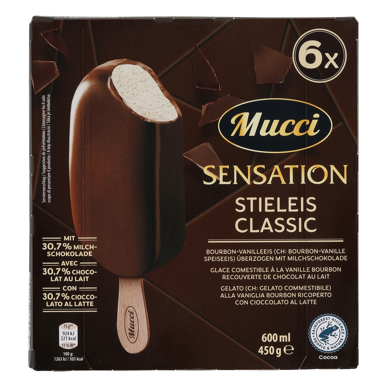 Das MUCCI Stieleis Premium Classic steht für puren Genuss in edler Form: Cremiges Vanilleglace umhüllt von einem knackigen Überzug aus feiner Milchschokolade – ein zeitloser Klassiker, der mit Qualität und Geschmack überzeugt.