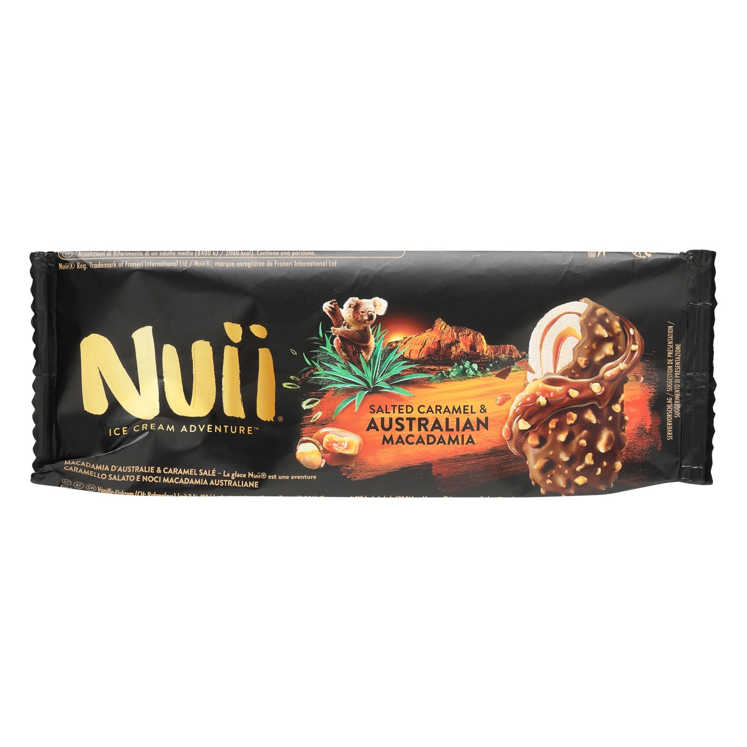 NUII Salted Caramel & Macadamia vereint cremige Karamellglace mit einer Hülle aus knackiger Milchschokolade, verfeinert mit gesalzenem Karamell und gerösteten Macadamianüssen. Das Ergebnis: Ein vollmundiger, süss-salziger Genussmoment mit exotischer Note.