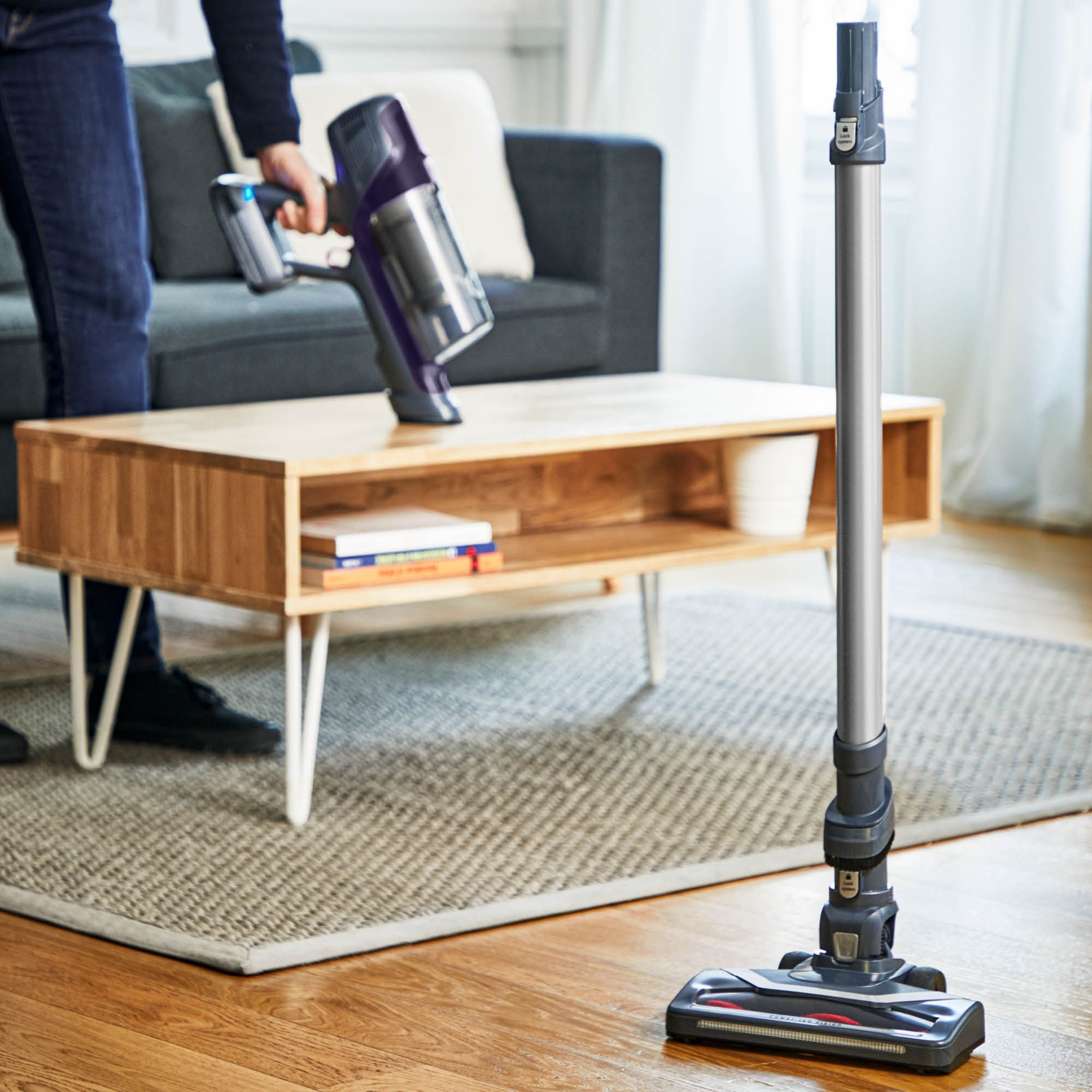 Mit der Stop & Go Position müssen Sie das Rohr nicht mehr auf den Boden legen, wenn Sie mit dem Handstaubsauger Möbel absaugen: Das Rohr und die Bürste bleiben eigenständig in aufrechter Position