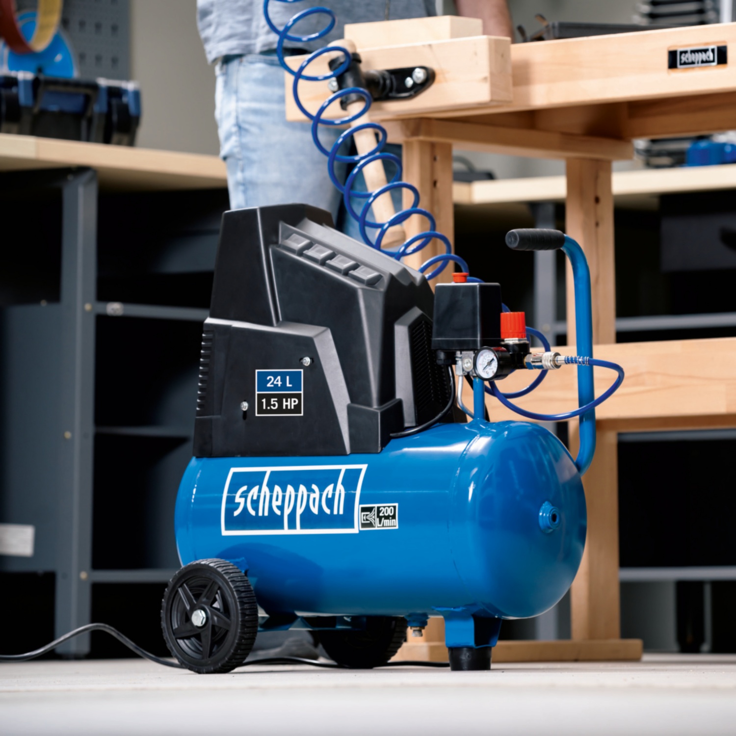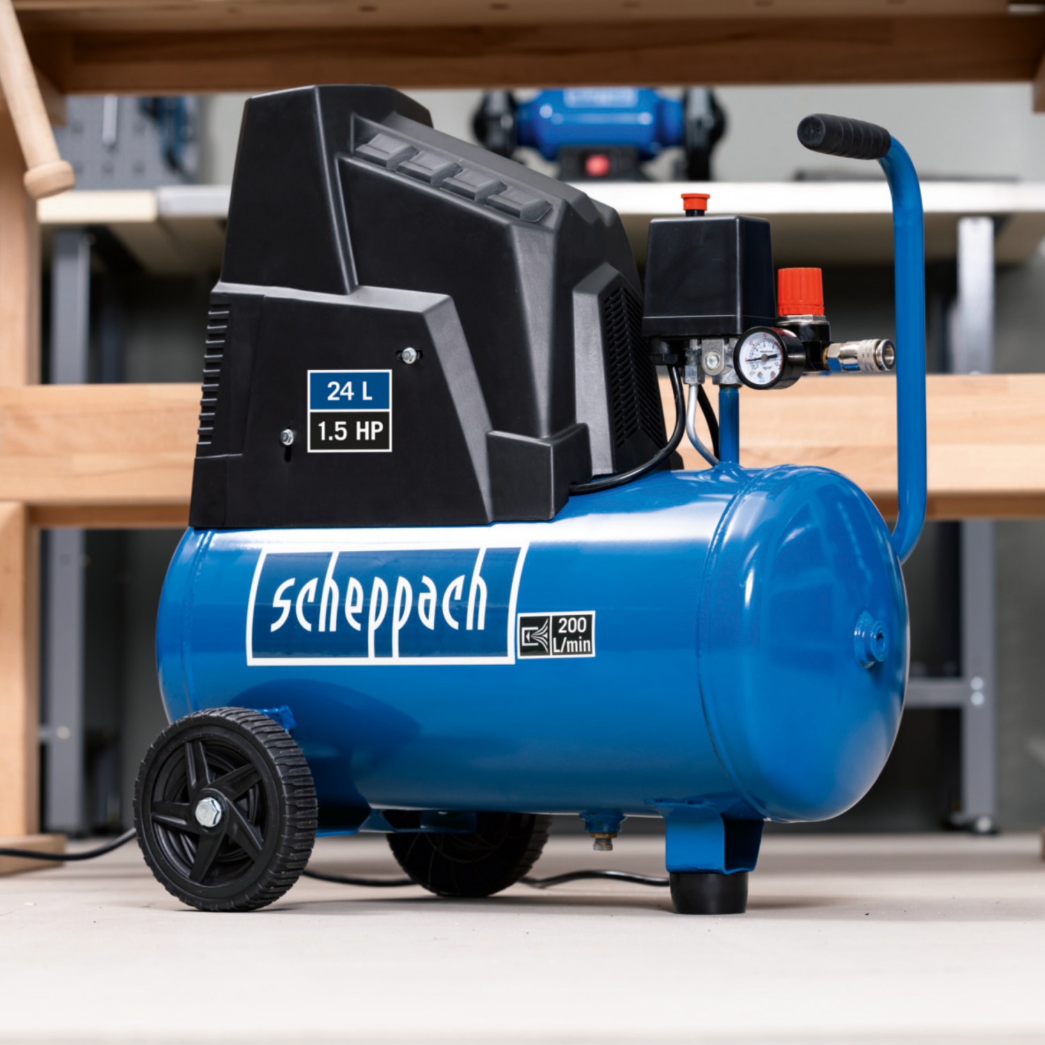 Mit seinem 1100 Watt Motor, dem 24 Liter Kessel und einer maximalen Ansaugleistung von 200 l/min eignet sich der Kompressor HC30o von scheppach ideal für die Verwendung kleinerer Druckluftwerkzeuge, wie etwa Nagelpistolen, Reifenfüller und Reinigungspistolen.