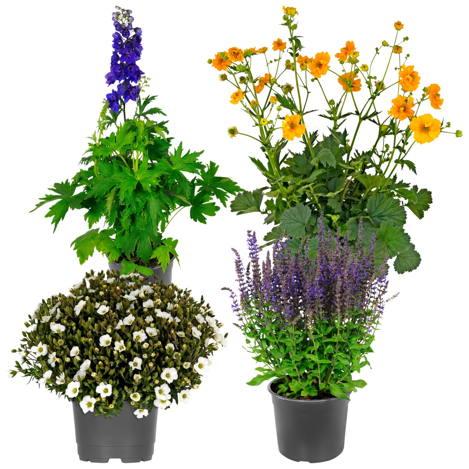 Im 19 cm-Kulturtopf, in verschiedenen Sorten wie Salvia, Nepeta und Delphinium,