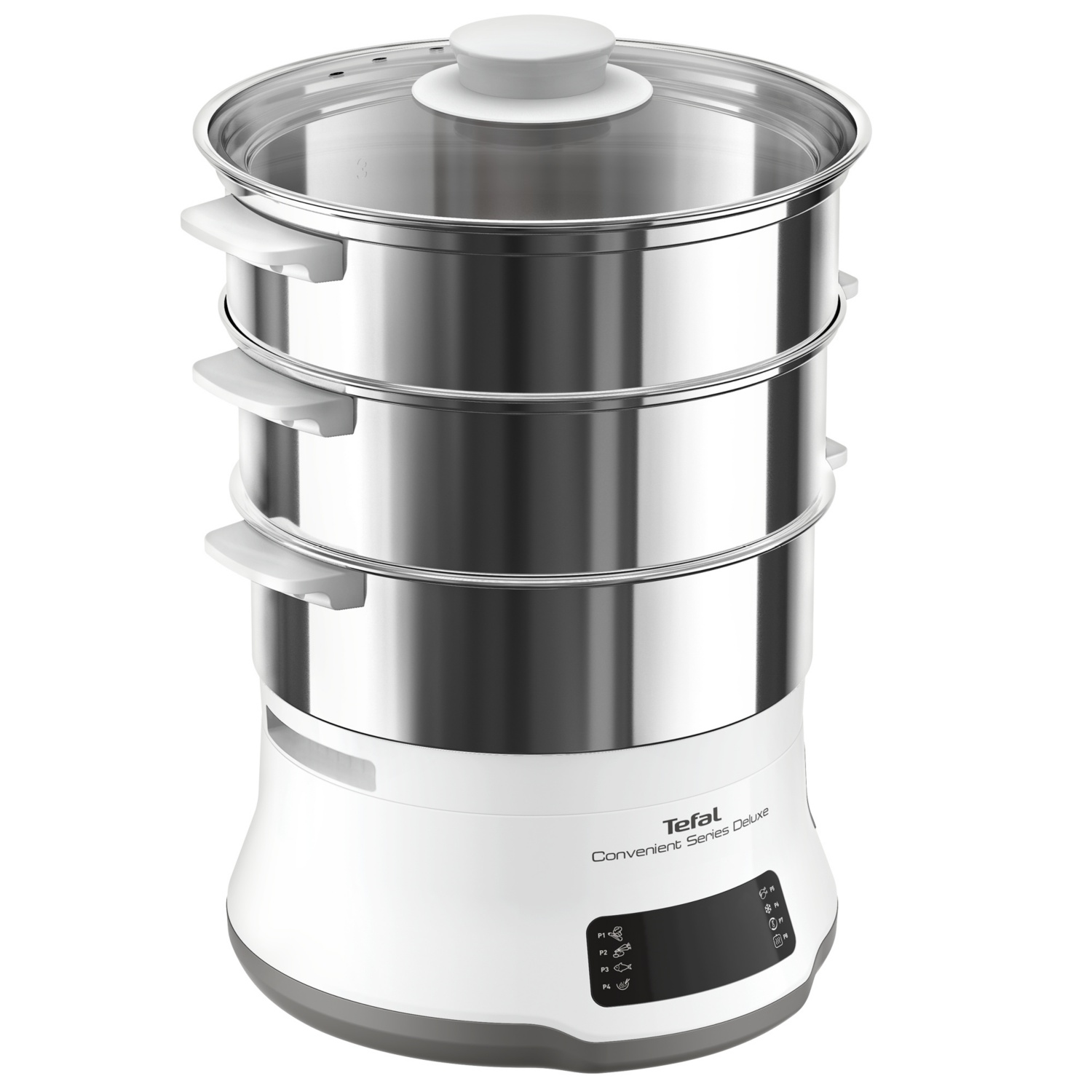 Gesunde und leckere Gerichte auf drei Ebenen! Der Dampfgarer Convenient Series Deluxe von Tefal ist die einfache Lösung für gesunde hausgemachte Gerichte jeden Tag. Entdecke müheloses Dampfgaren mit digitalen Bedienelementen auf einem benutzerfreundlichen Touchscreen. Die acht Garprogramme und die hochwertigen Behältern aus Edelstahl sorgen für eine kompromisslose Qualität und einen einwandfreien Geschmack Ihrer Zubereitungen. Das mehrstufige Design dieses Dampfgarers ermöglicht es dir, ein Drei-Gänge-Menü in einem einzigen Durchgang zuzubereiten. Über den Touchscreen lassen sich acht vielseitige Programme auswählen: fünf Voreinstellungen pro Zutat (weiches Gemüse, hartes Gemüse, Fisch, Reis/Gemüse, Geflügel) sowie Voreinstellungen zum Auftauen, Aufwärmen und Warmhalten. Spare dank des dreistufigen Dampfgarers Zeit in der Küche. Ein Drei-Gänge-Menü kann in einem einzigen Durchgang zubereitet werden, beispielsweise mit einem Behälter für Poulet, einem für Gemüse und einem für Reis – für herzhafte Gerichte für bis zu vier Personen.