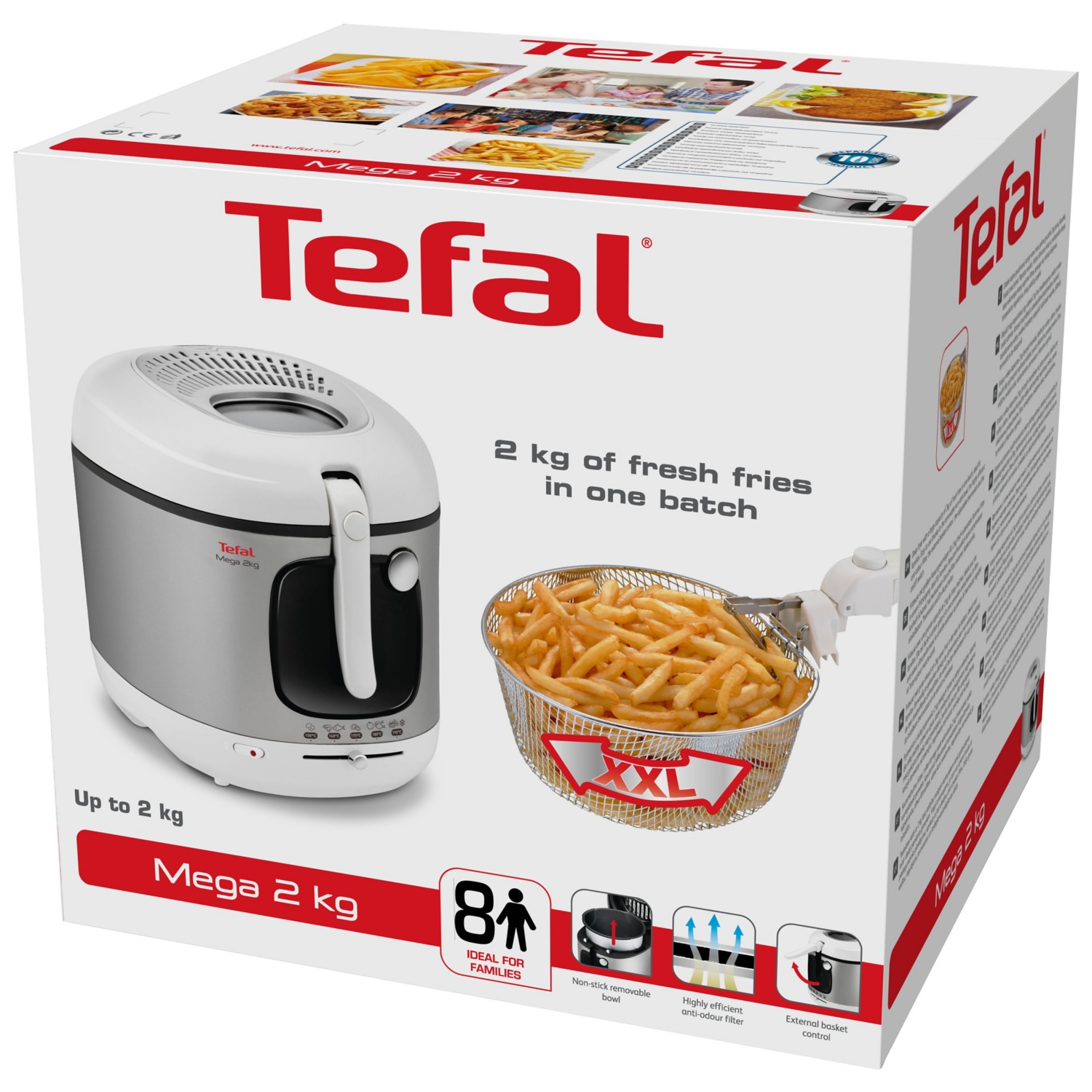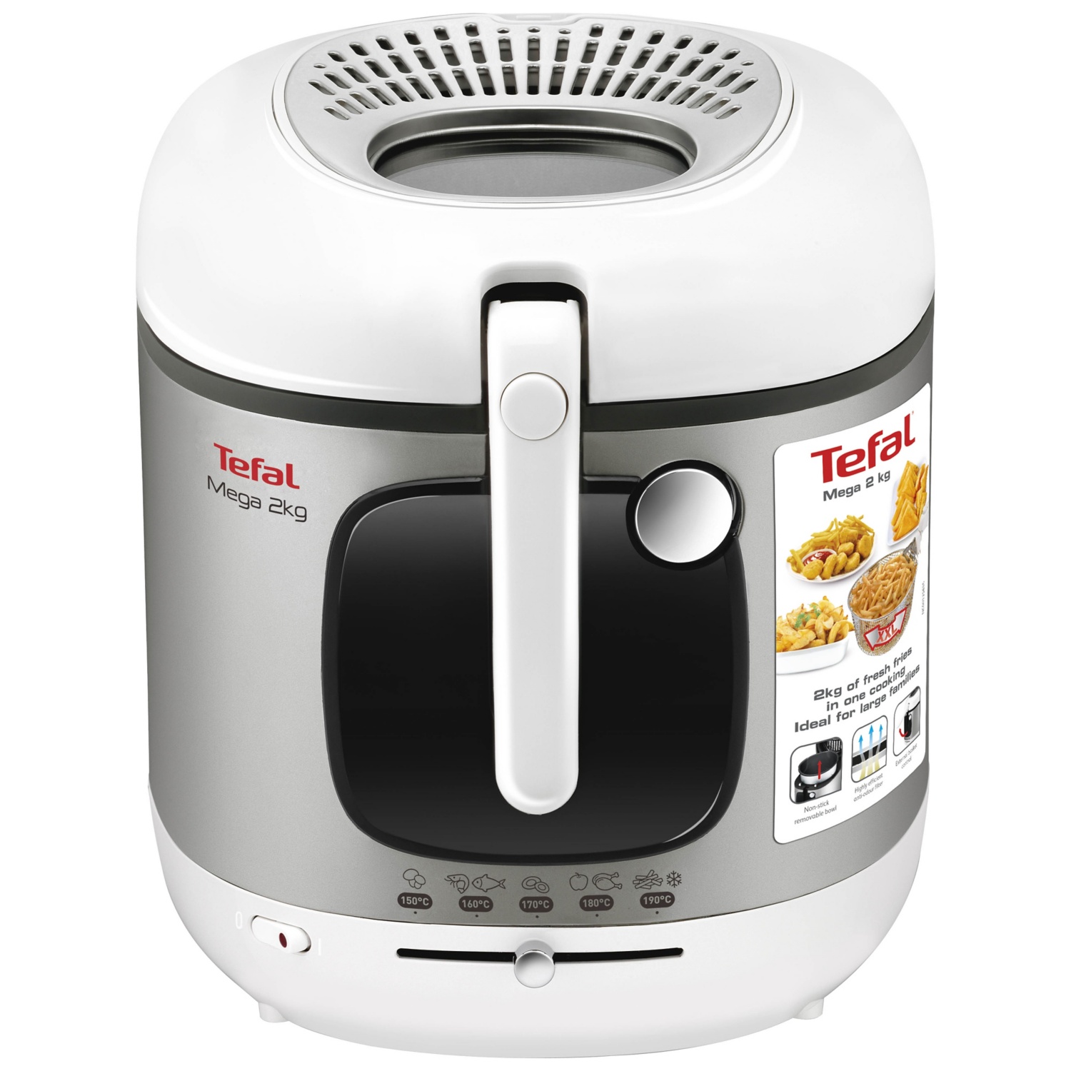 Die Mega 2 KG Fritteuse von Tefal macht das Frittieren für die ganze Familie ganz einfach! Sie hat das grösste Fassungsvermögen unter den Fritteusen von Tefal und ermöglicht die Zubereitung von bis zu 2 kg Pommes frites in einem einzigen Durchgang. Das moderne Design in silber und schwarz mit glänzendem Metallknopf zum Öffnen des Deckels besticht in jeder Küche. Dank der abnehmbaren Schüssel mit Antihaftbeschichtung ist diese Fritteuse einfach zu reinigen, zudem sind alle Teile (ausser das Gehäuse) spülmaschinenfest. Mit der Tefal Mega XXL Fritteuse kannst du in nur wenigen Minuten köstliche und knusprige Pommes frites zubereiten! Ideal für grosse Familien bis zu acht Personen. Dank des praktischen Sichtfensters lässt sich der Garvorgang stets überwachen. Die Temperatur kann von 150 °C bis 190 °C variiert werden. Der Ein/Aus-Schalter der Fritteuse hat zudem eine Temperaturkontrollleuchte.