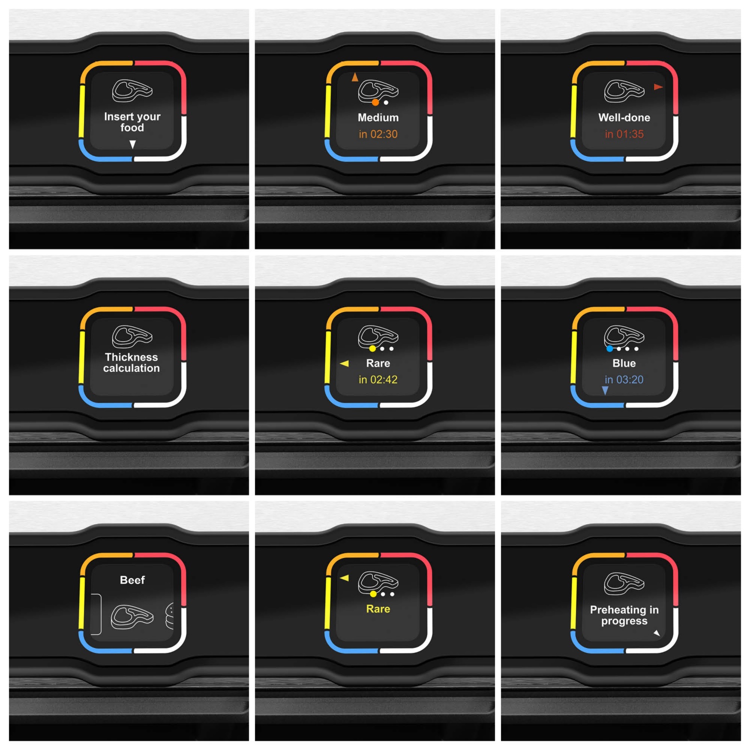 - Automatische Programme: Burger, Geflügel, Steak, Wurst, Sandwich/Panini, Fisch, Meeresfrüchte, Speck, Schweinefleisch, Kartoffeln, Peperoni, Tomaten, Aubergine