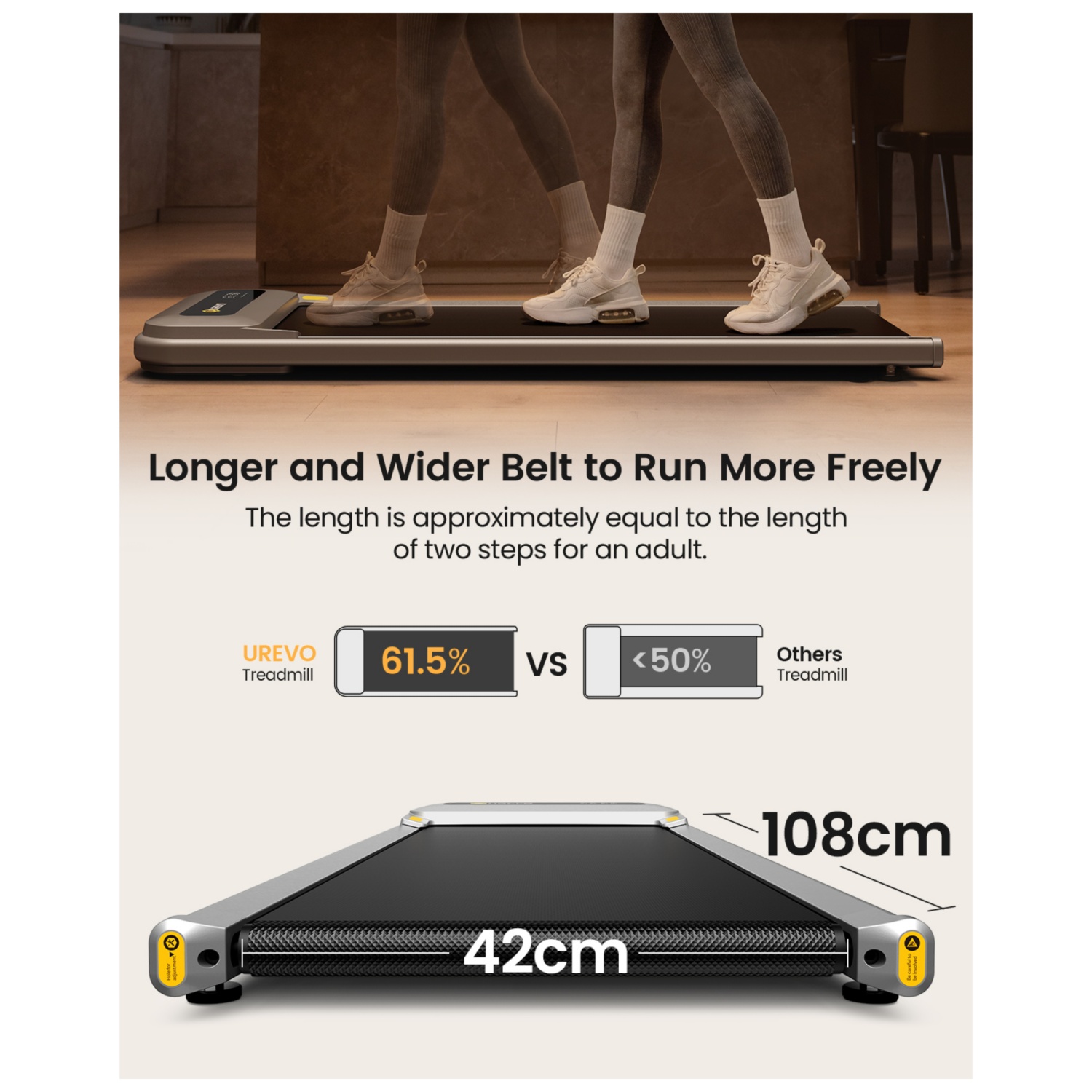 Fitness leicht gemacht. Längeres und breiteres Laufband für mehr Bewegungsfreiheit. Die Länge entspricht ungefähr der Länge von zwei Schritten eines Erwachsenen.