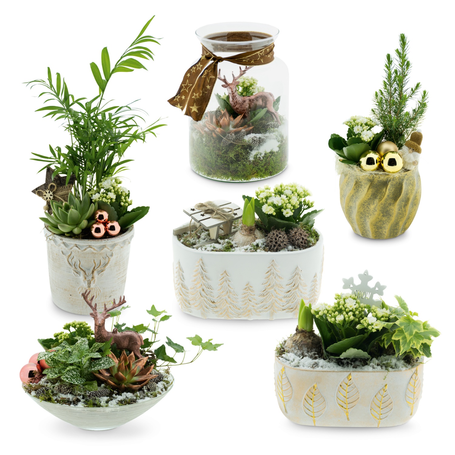 diverse weihnachtliche Gefässe, bepflanzt mit verschiedenen Grün- und Blühpflanzen wie Sukkulenten, Kalandiva, Hyazinthen etc., inkl. verschiedenen Dekoelementen Artikelnummer: 732570
