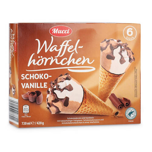 Die MUCCI Waffelhörnchen Schoko-Vanille vereinen zwei beliebte Glacesorten in einem klassischen Hörnchen: cremiges Schokoladen- und Vanilleglace, harmonisch kombiniert und eingebettet in eine goldbraune, knusprige Waffel. Verfeinert mit schokoladiger Glasur und Topping bietet dieses Glace ein rundum genussvolles Erlebnis.Ideal als sommerlicher Snack, zum Teilen oder als süsser Abschluss eines Menüs – dieser Klassiker passt einfach immer.Highlights