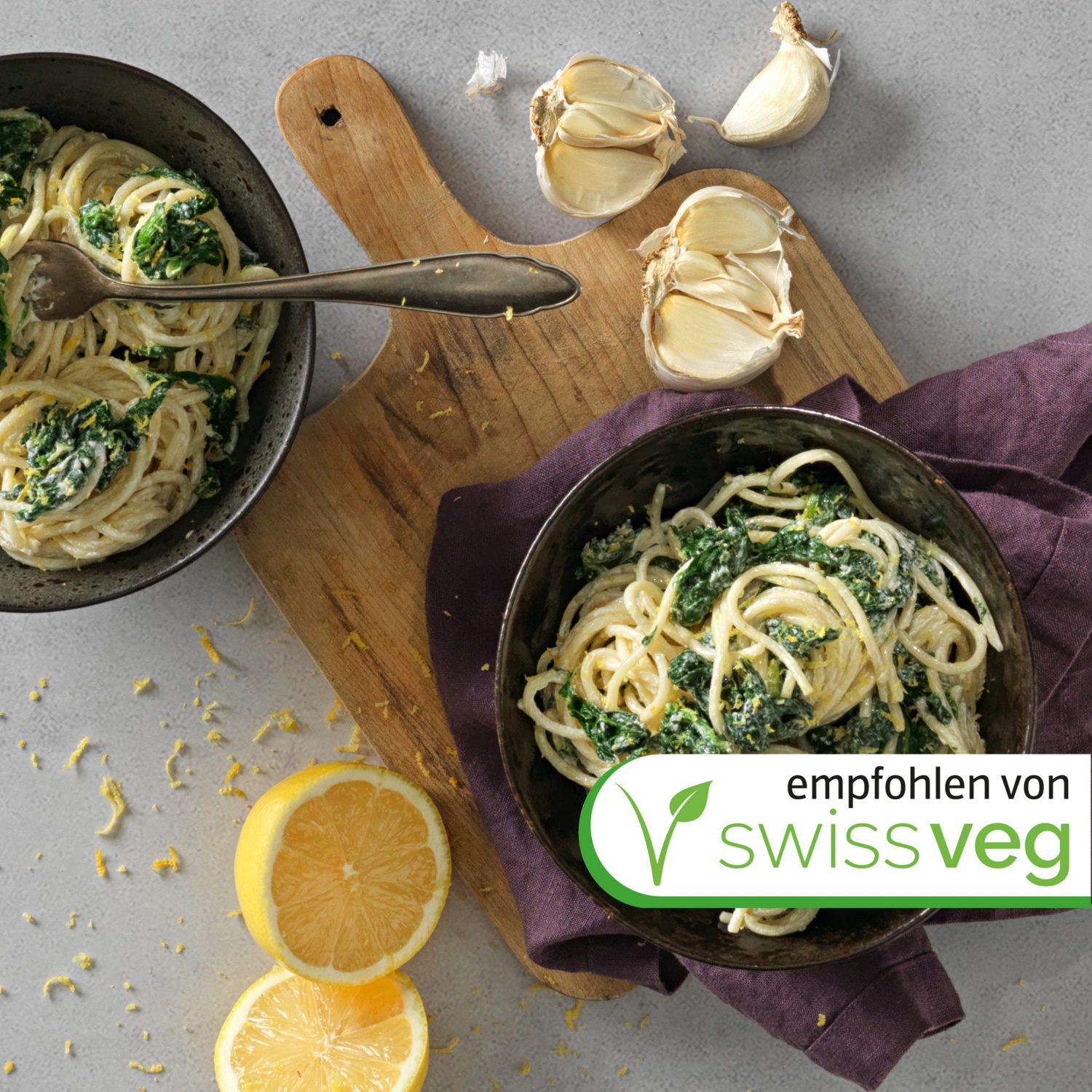 In einer heissen Pfanne mit Olivenöl Knoblauch und Chili anbraten. Mit Kochwasser, Zitronenabrieb und Saft ablöschen und kurz köcheln lassen.