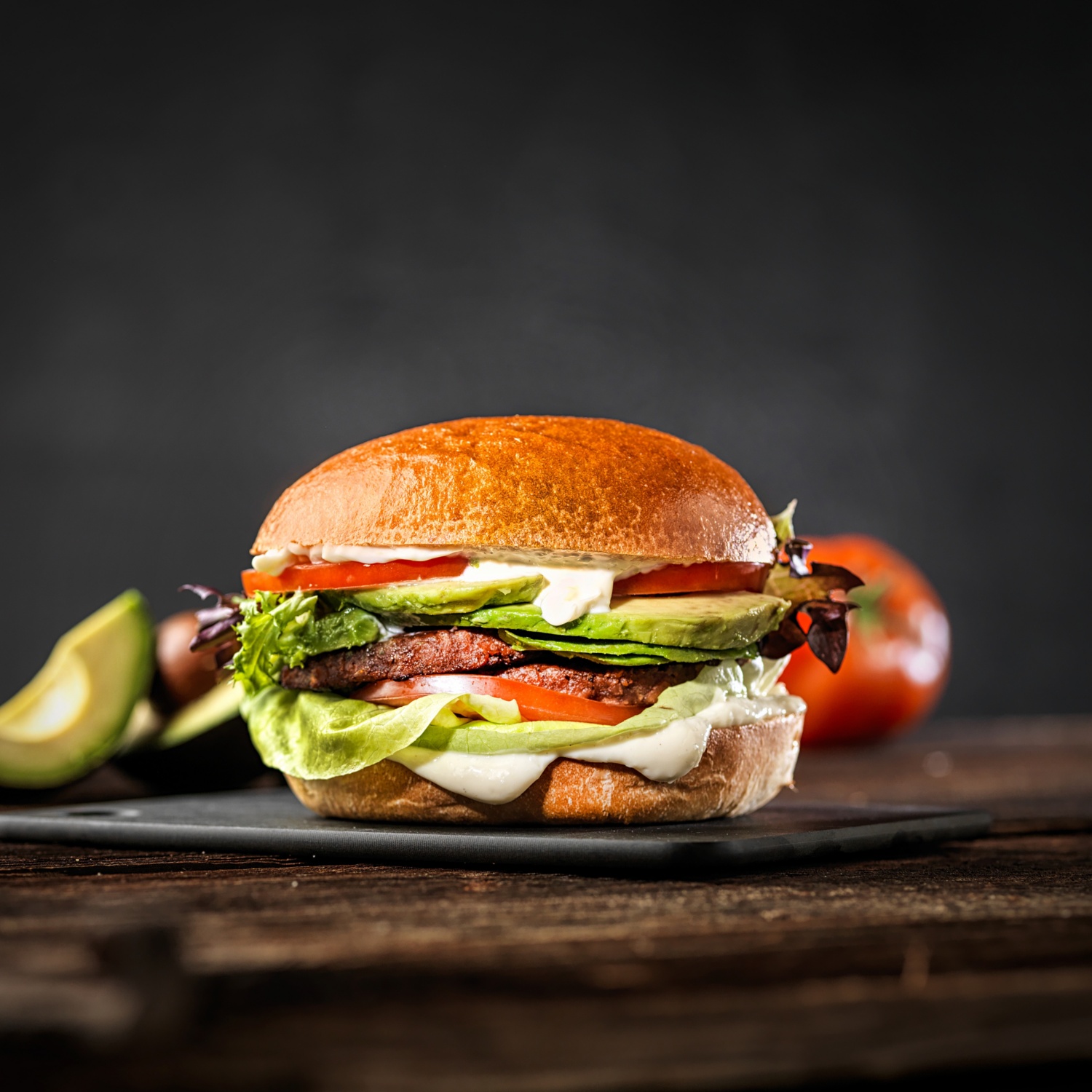 - Burgerbrötchen-Unterhälften mit Crème Fraîche, etwas Salat und Tomatenscheiben belegen. Zwei Burger-Patties darauflegen. Avocado- und Tomatenscheiben, Salat und etwas Crème Fraîche darauf geben und mit den Brötchen-Oberhälften zudecken.