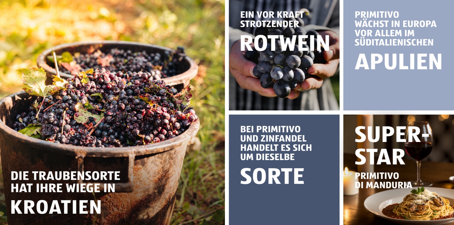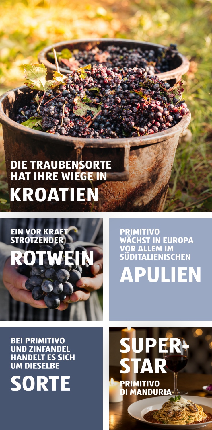 Ein offenes Geheimnis ist allerdings, dass die Rotweinrebe im frühen 19. Jahrhundert in die USA eingeführt wurde. Primitivo hat in Übersee unter dem Namen Zinfandel sehr grossen Erfolg und wird sogar als amerikanische Nationaltraube angesehen.