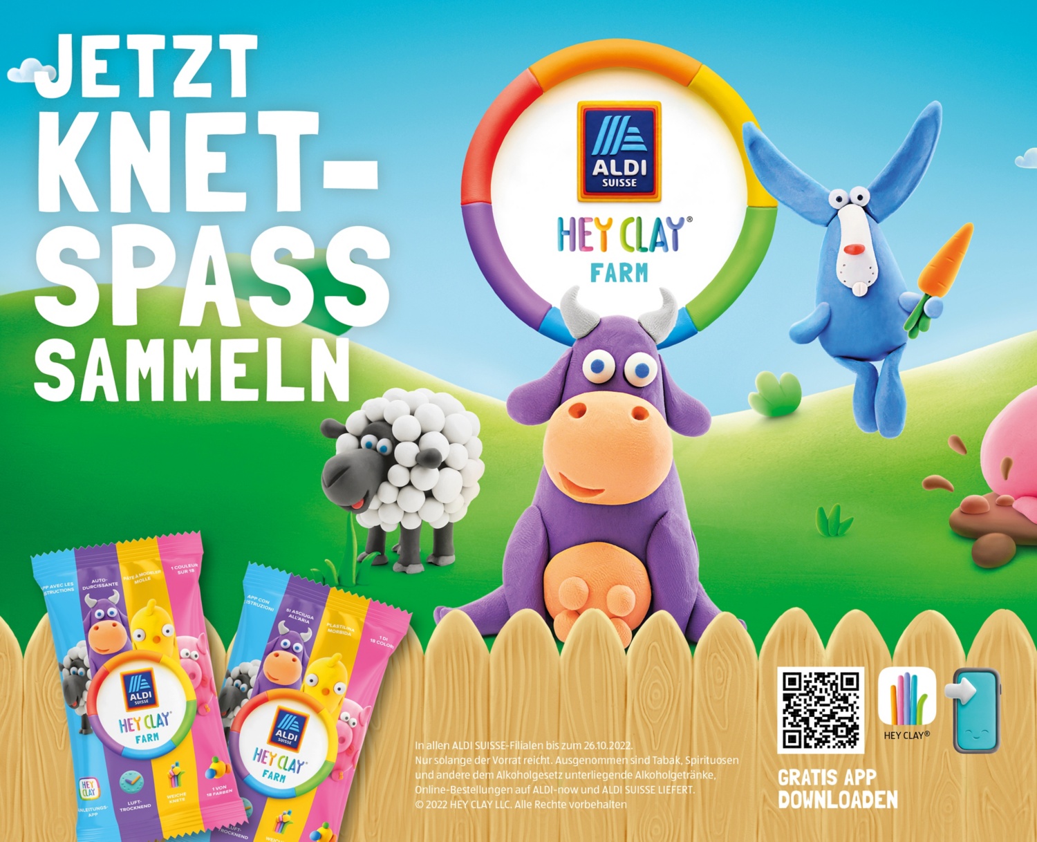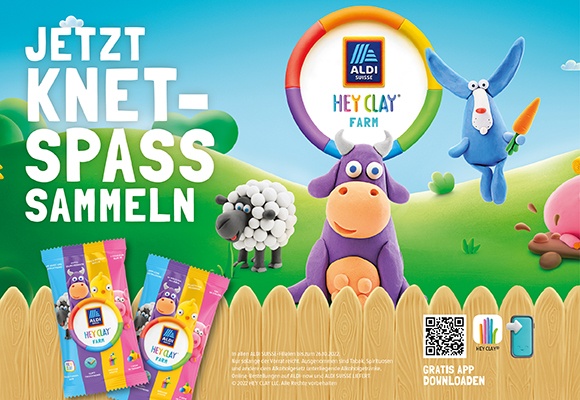 Während der kommenden acht Wochen werden die putzigen «Hey Clay»-Knet-Tierli die kleinen und grossen Kundinnen und Kunden bei ALDI SUISSE verzaubern. Ab dem 1. September 2022 gibt es in allen ALDI SUISSE-Filialen pro 20 Franken Einkauf ein kostenloses Sammelpäckli mit biologisch abbaubarer Knete dazu. Daraus können zu Hause bunte Farm-Tiere kreiert werden. Es ist das zweite Mal in der Firmengeschichte, dass der Schweizer Detailhändler eine solche Sammelkampagne lanciert. Die Aktion dauert bis zum 26. Oktober 2022.