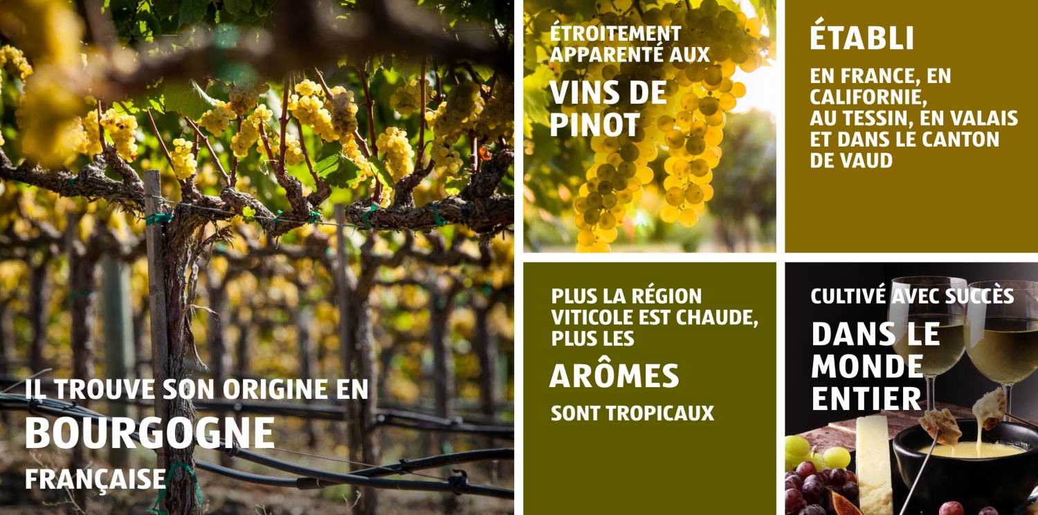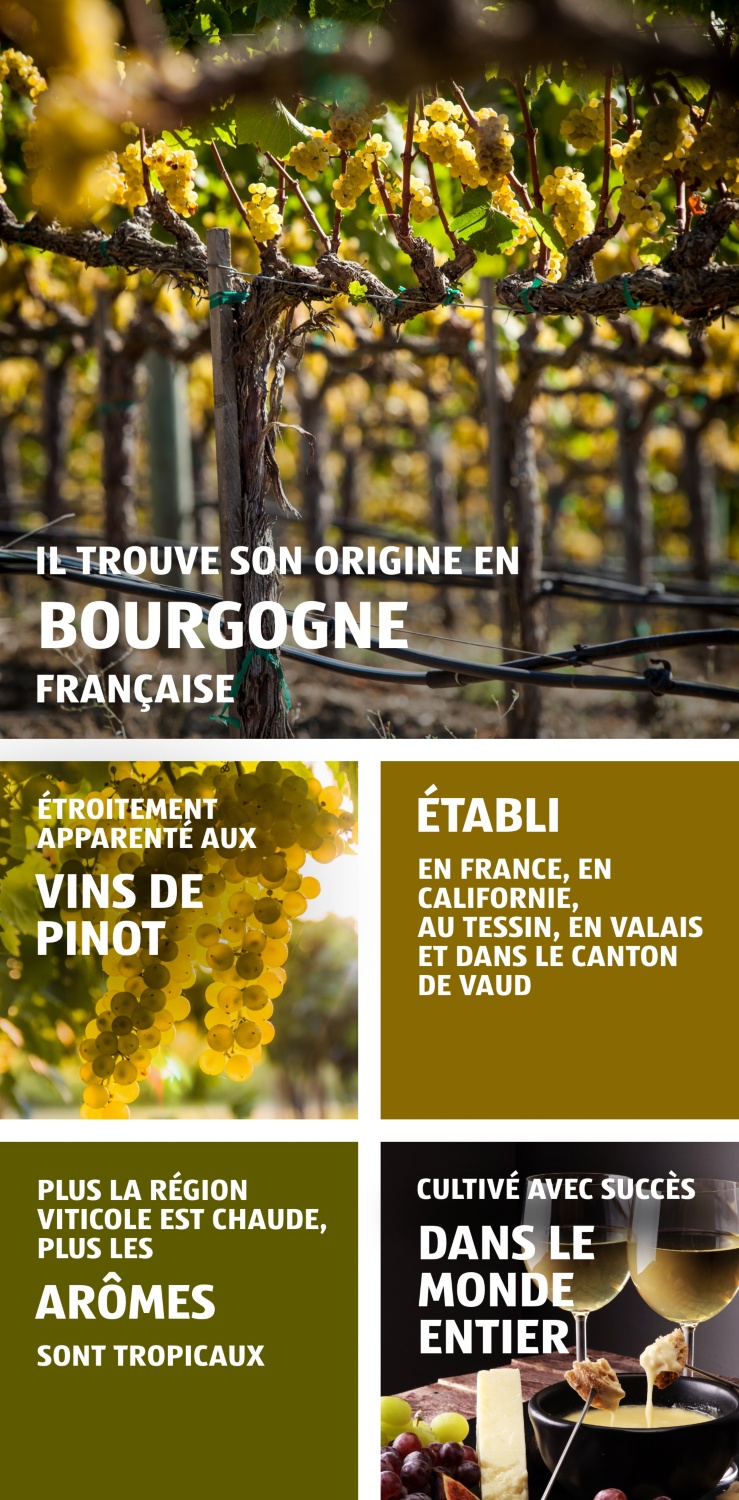 La vigne a reçu son nom d’une petite commune française du même nom. Tout comme pour le Pinot Noir, les moines cisterciens et bénédictins sont responsables de la propagation de ce cépage blanc en Europe. Depuis l’Europe, les raisins ont poursuivi leur marche victorieuse et sont aujourd’hui cultivés avec succès dans le monde entier.