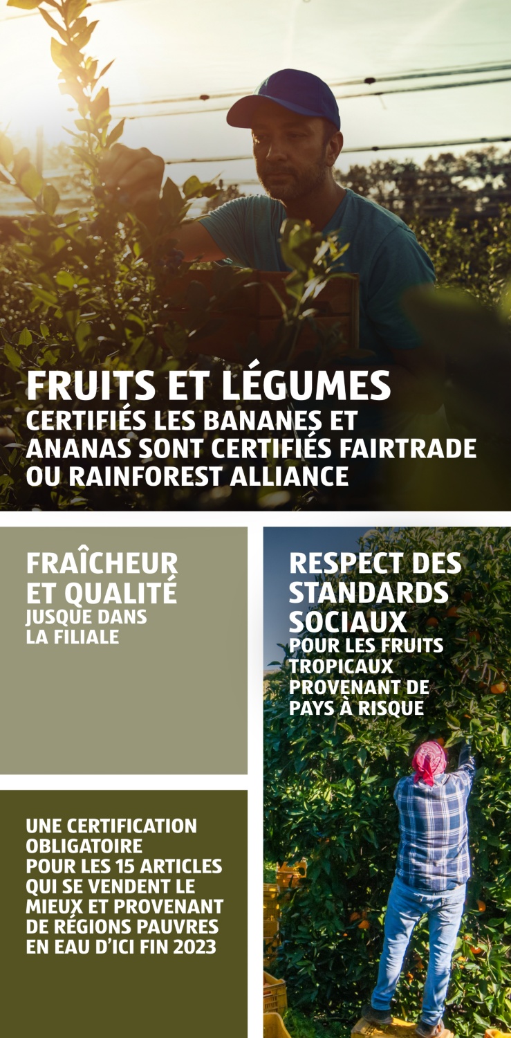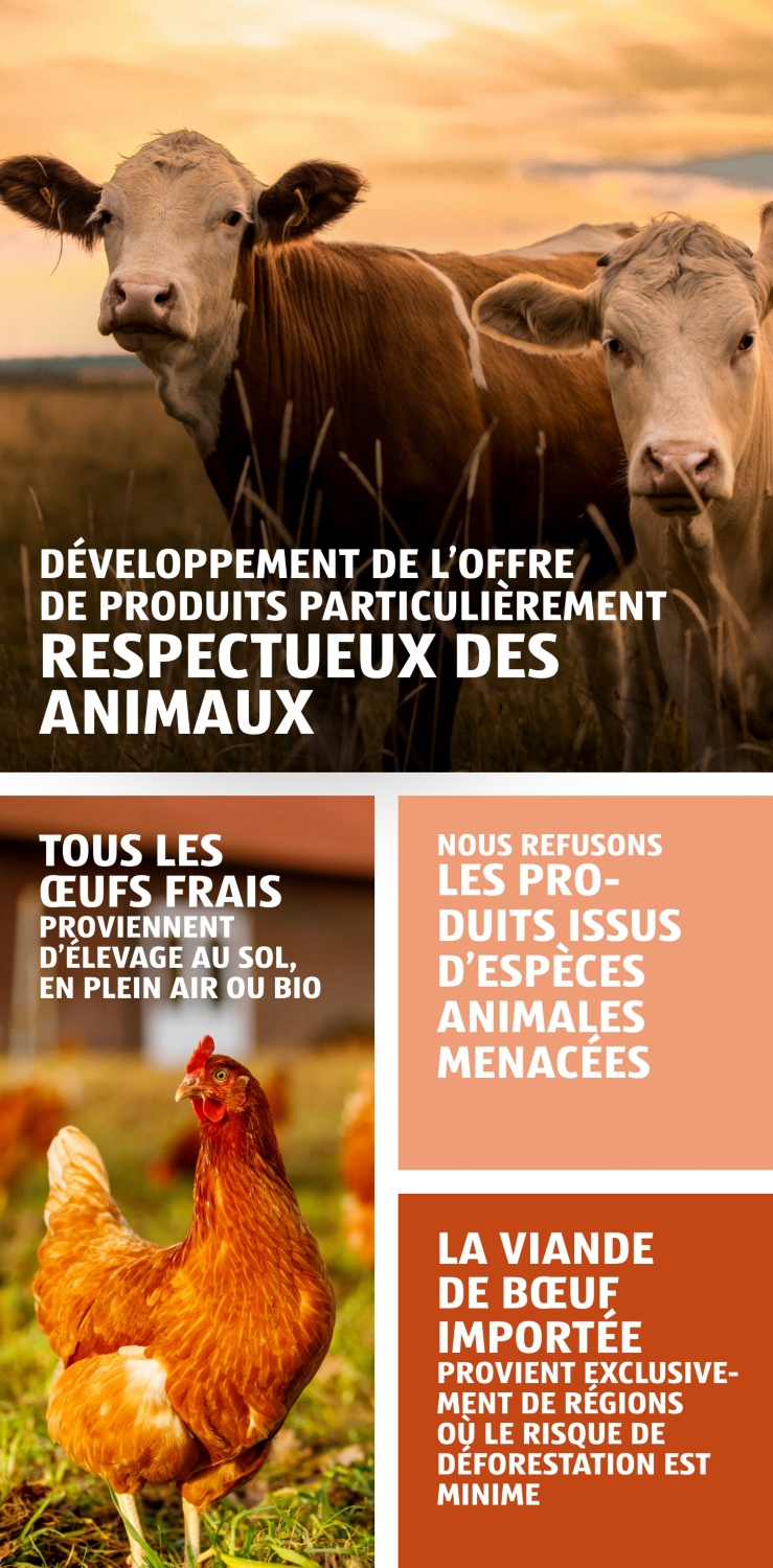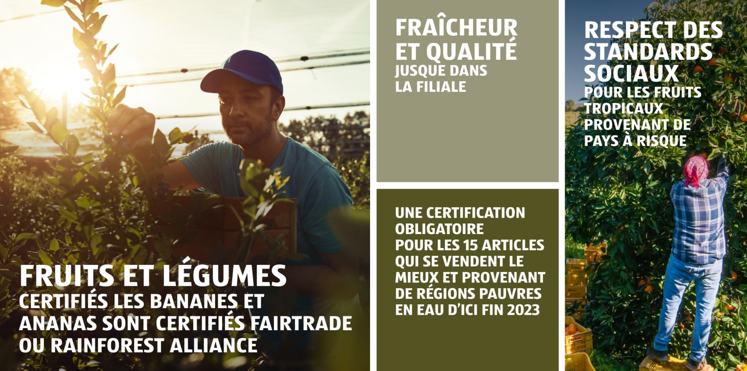 En plus d’un nombre croissant d’aliments BIO, nous proposons également de nombreux produits du commerce équitable, ainsi que du poisson et des fruits de mer issus d’une pêche responsable et des denrées alimentaires qui tiennent particulièrement compte du bien-être des animaux. Pour nous, la fraîcheur et la qualité sont indispensables. Nous sommes très exigeants envers nos fournisseurs et nous les contrôlons régulièrement.