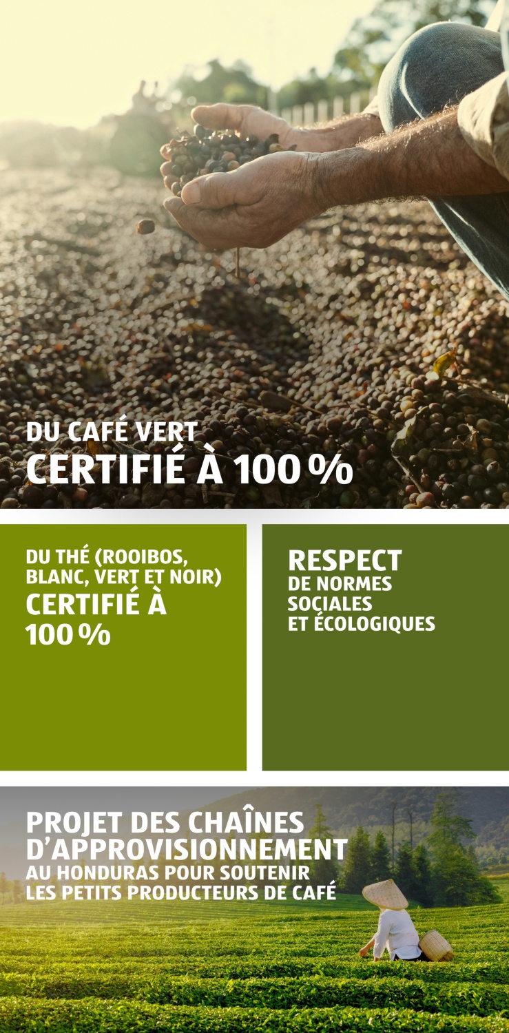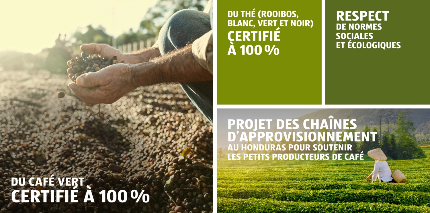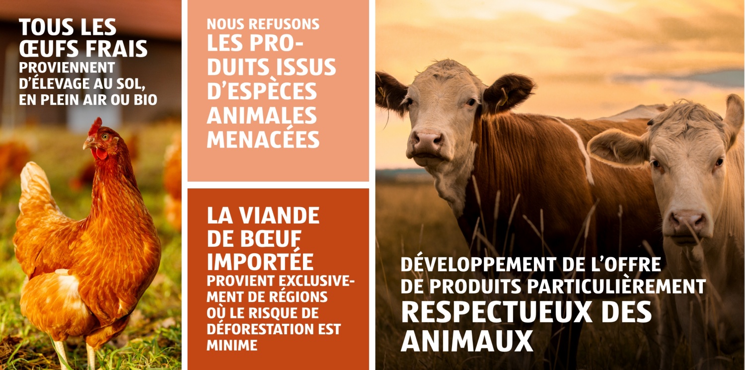 En plus d’un nombre croissant d’aliments BIO, nous proposons également de nombreux produits du commerce équitable, ainsi que du poisson et des fruits de mer issus d’une pêche responsable et des denrées alimentaires qui tiennent particulièrement compte du bien-être des animaux. Pour nous, la fraîcheur et la qualité sont indispensables. Nous sommes très exigeants envers nos fournisseurs et nous les contrôlons régulièrement.