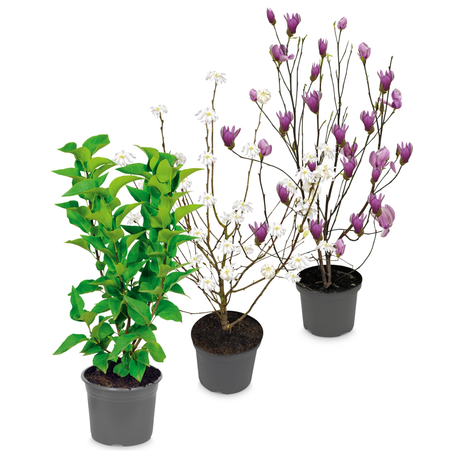 Dans un pot de 19cm, hauteur avec pot: 40 à 80cm (selon la variété), par ex. amandier, cerisier d'ornement, lilas ou magnolia