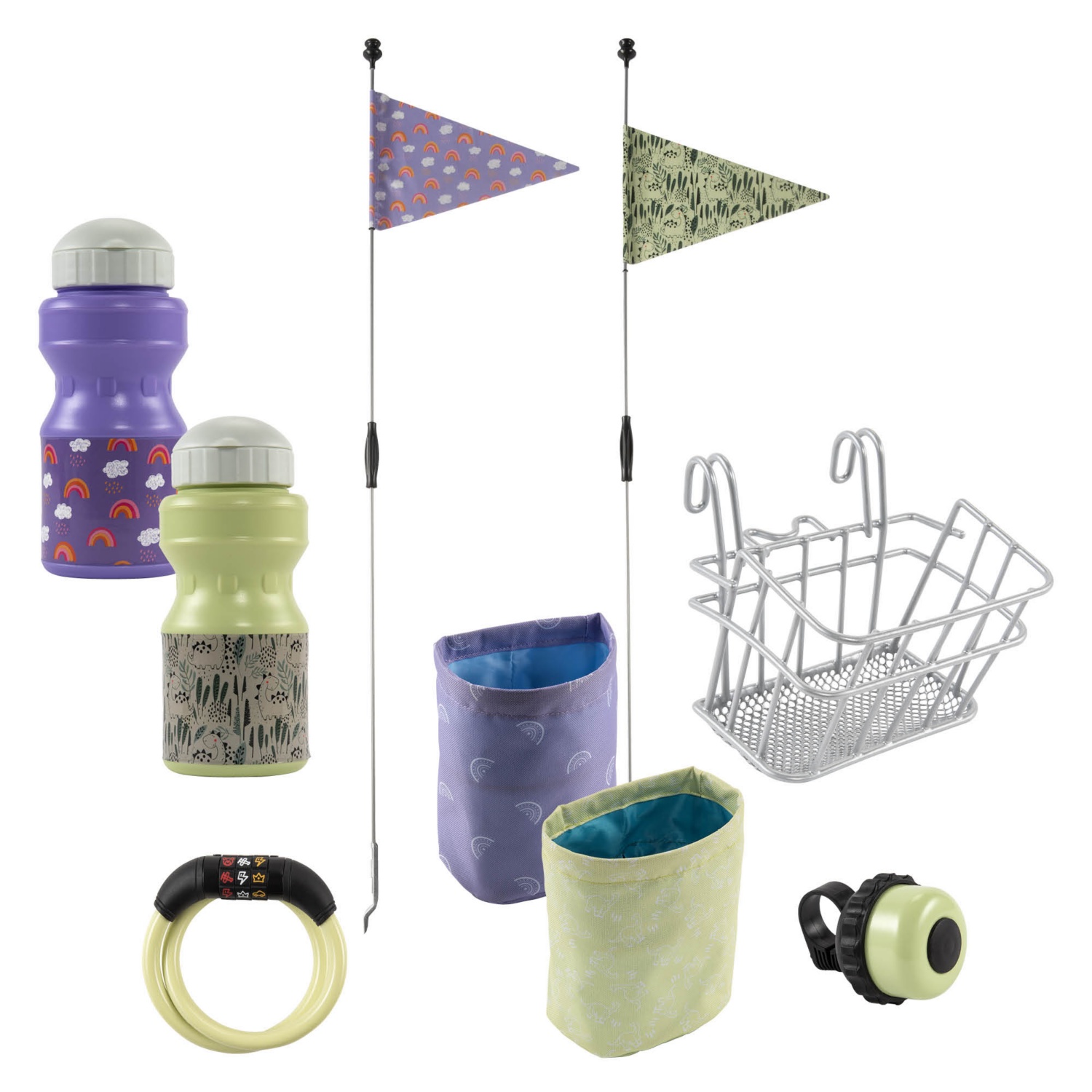 6 accessoires (klaxon, drapeau, panier de guidon, etc.) dans différents designs