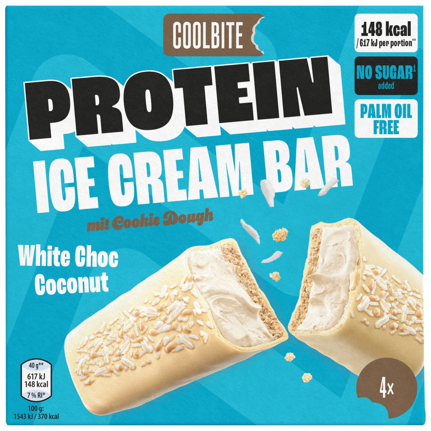 La barre glacée protéinée au chocolat blanc de la marque COOLBITE allie une glace délicate à une portion de protéines supplémentaire, pour ceux qui veulent se faire plaisir dans le cadre d’une alimentation consciente. La coque fondante en chocolat blanc enrobe un cœur de glace crémeux, qui n’est pas seulement délicieux, mais fournit également de précieuses protéines de lactosérum.