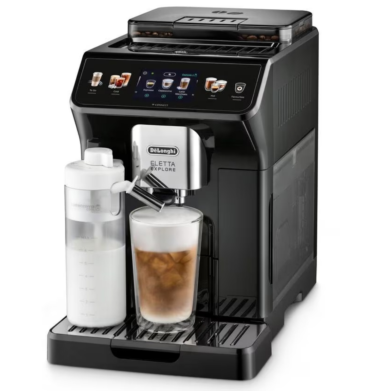 La machine à café automatique Eletta Explore est très polyvalente et propose plus de 50boissons (chaudes, froides, à emporter) par simple pression d’un bouton. Avec ses 2carafes, la LatteCrema Hot Technology et la LatteCrema Cool Technology, elle prépare de délicieuses boissons au lait froid et chaud. Le système Latte Crema est également idéal pour les boissons végétales comme le lait de soja, d’avoine et d’amande. Avec la Cold Extraction Technology, tu peux préparer des boissons lactées froides à la demande en moins de 3minutes. L’eau circule autour de l’unité de chauffe et atteint la zone d’infusion à température ambiante. L’infusion, identifiable par le comportement pulsatoire de la pompe, se fait à basse pression et le café est extrait lentement, comme avec la méthode du goutte-à-goutte.