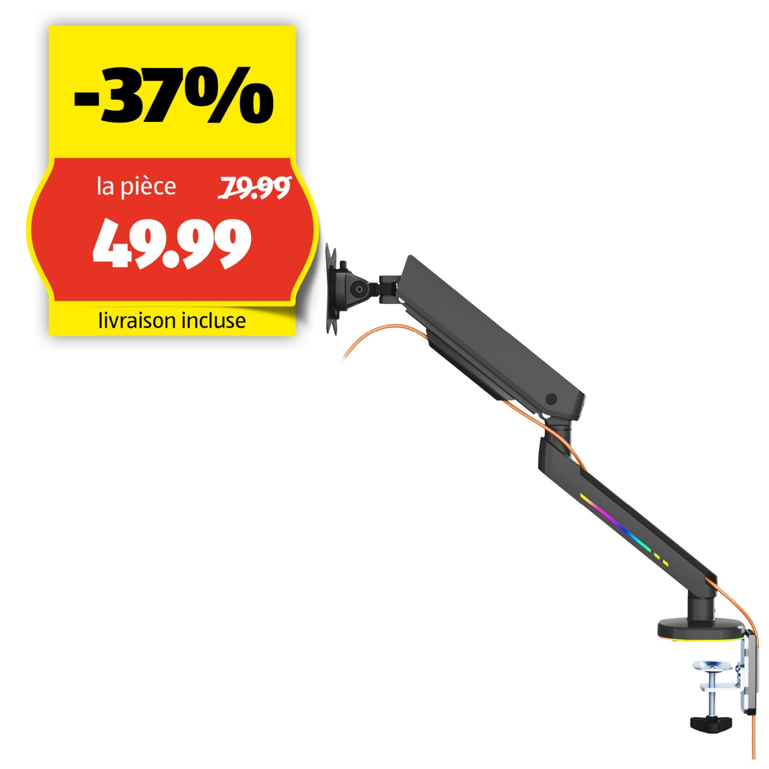Bras simple pour moniteur de gaming RGB pour une lumière ambiante derrière le moniteur. Le système de gestion des câbles intégré assure une installation propre tout en maintenant le moniteur en place pour un angle parfait. La conception de la plaque VESA amovible facilite l'installation de l’écran sur le bras. Le bras s'adapte aux écrans jusqu'à 32" avec un poids maximal de 9 kg et est conçu pour les écrans courbés. L'éclairage RGB est contrôlé par la télécommande fournie et vous permet de régler la lumière ambiante parfaite pour vos besoins.