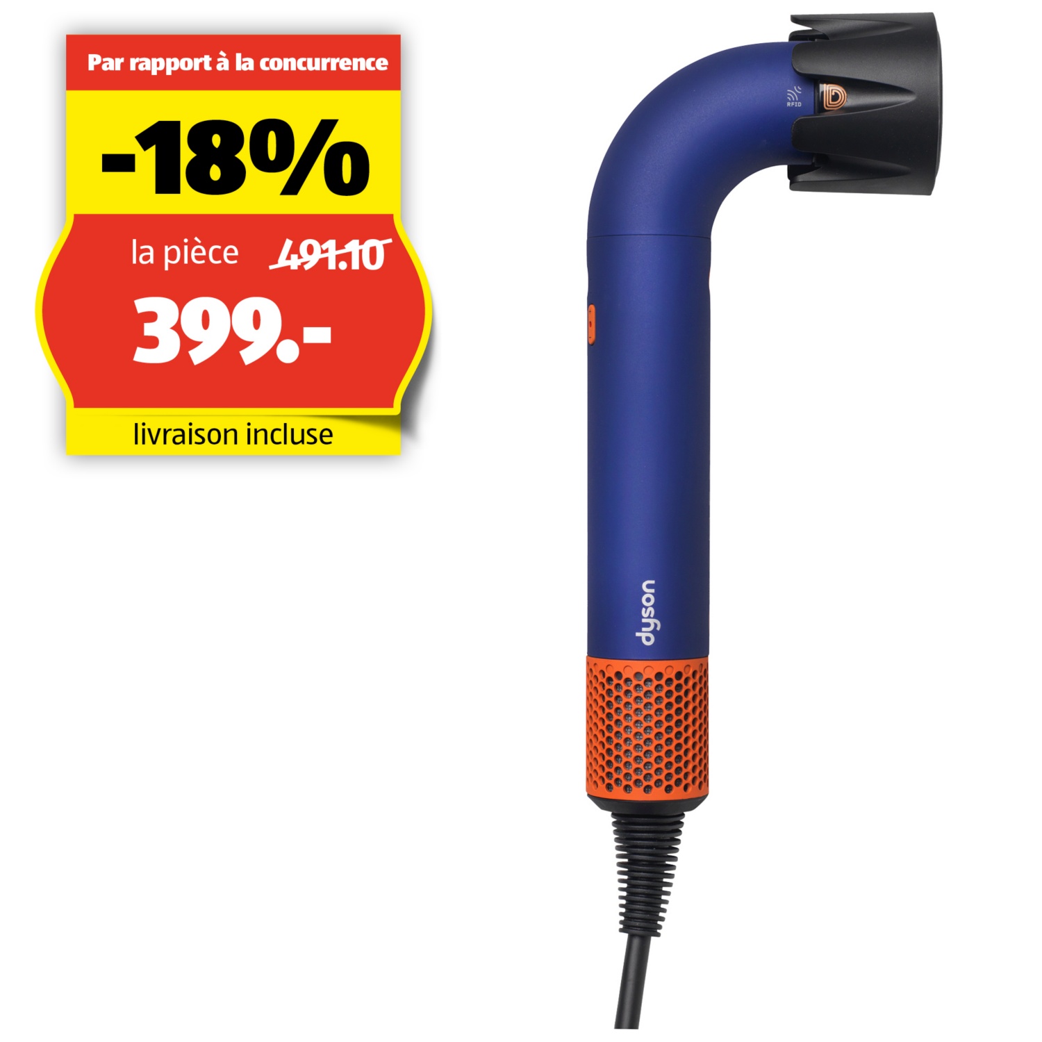 Le sèche-cheveux Dyson Supersonic r™ Professional est l’outil de stylisme le plus léger, le plus petit et le plus précis de Dyson. Il se distingue par des technologies particulièrement performantes: un élément chauffant optimisé, le moteur Dyson Hyperdymium™ et des puces RFID intelligentes dans chaque embout qui communiquent avec l’appareil. La puissance du moteur et de l’élément chauffant est ainsi automatiquement ajustée afin de garantir une température et un flux d’air optimaux.