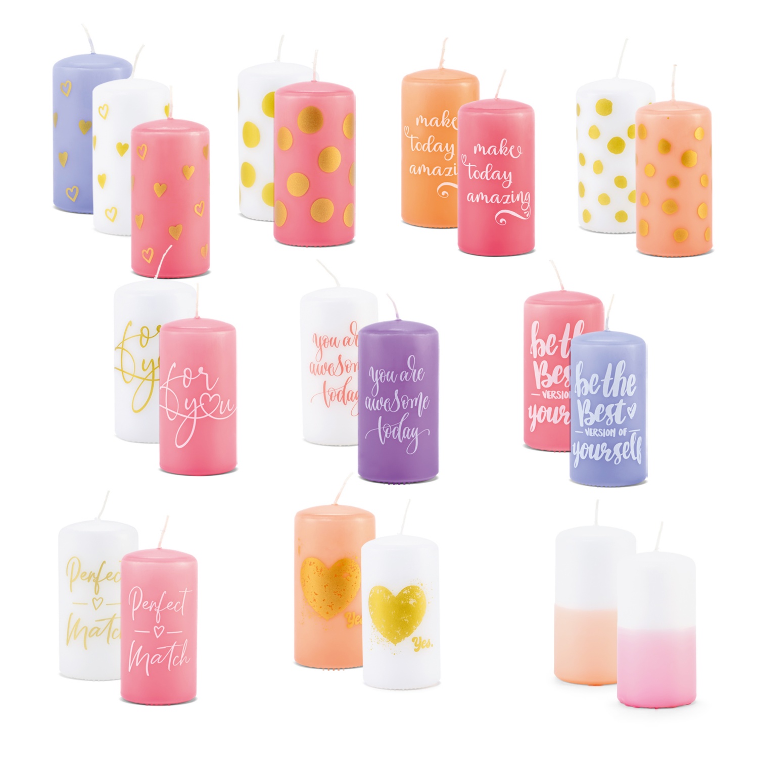 - bougies longues à pois ou messages: 18 × 2.2 cm, durée de combustion 6 heures, ou