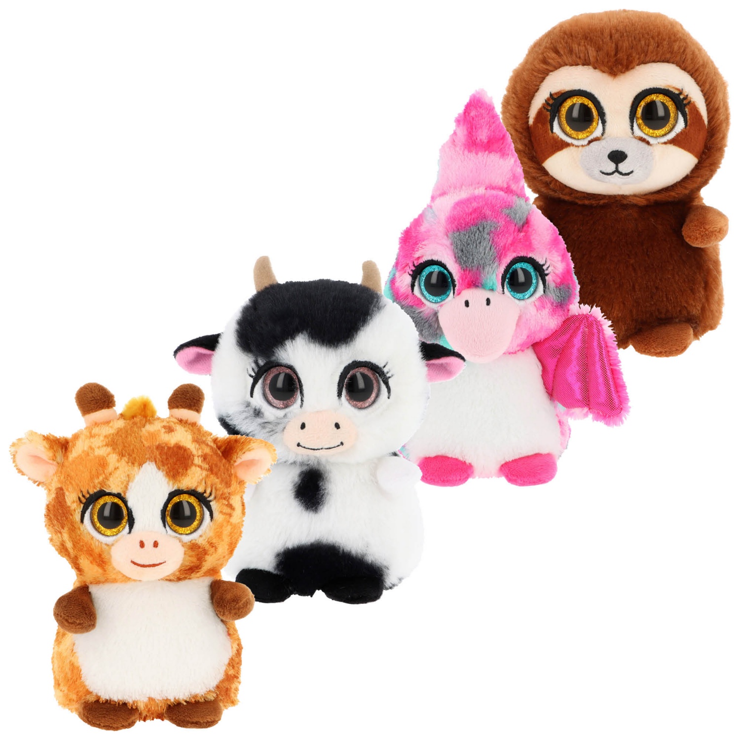 Animaux en peluche avec de grands yeux scintillants et en partie avec des détails scintillants dans la peluche.