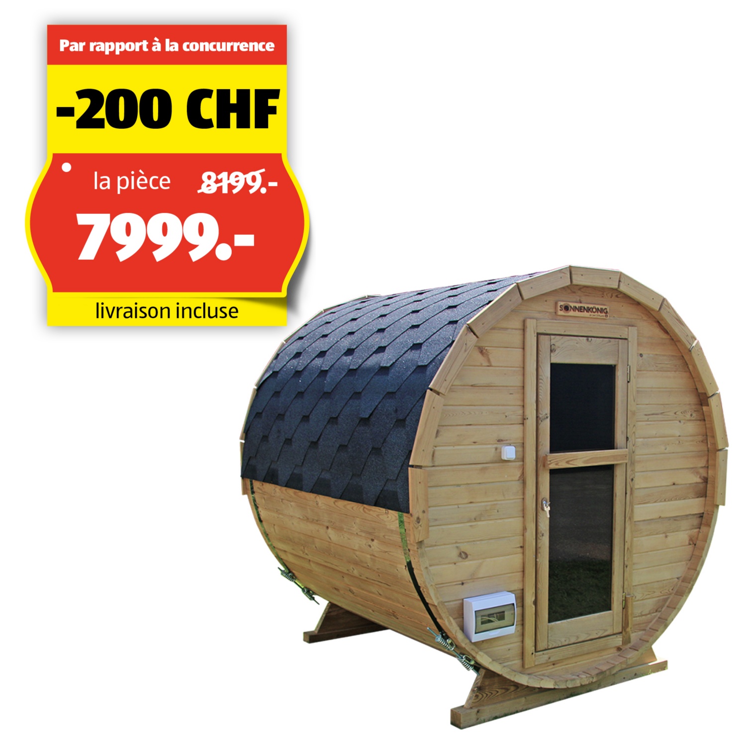 Chez ALDI SUISSE AG, la livraison et le montage, excl. grue, des bains à remous et sauna Sonnenkönig à tonneau sont inclus dans le prix d'achat. Profite de notre service sans frais cachés et laisse nos spécialistes te livrer ton espace bien-être à domicile en tout confort.