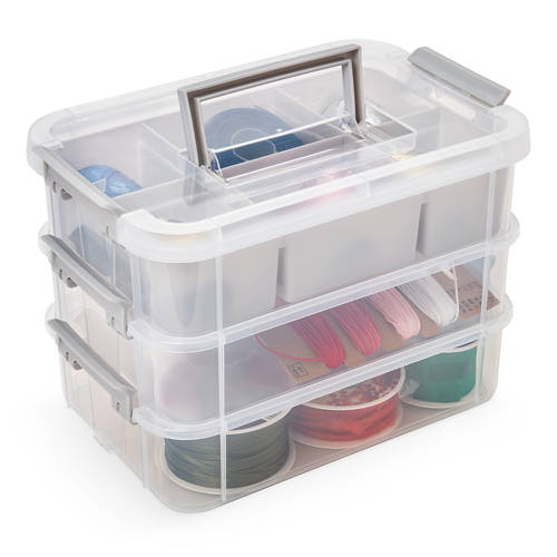 • Boîtes empilables (L 27,5 x l 18 x H 19,5cm) avec 3 couches et insert à 6 compartiments, et fermeture en différentes couleurs