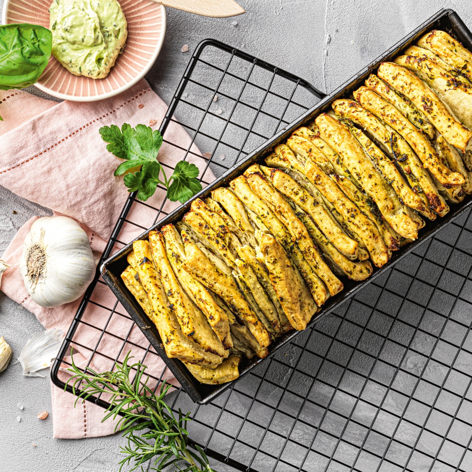 - Quand la pâte a fini de lever, étale-la pour former un rectangle d’env. 1 cm d’épaisseur. Découpe le rectangle en cinq bandes d’env. 5 cm de largeur et badigeonne-les avec le beurre aux herbes. Superpose les bandes et coupe la pile en cinq gros cubes de même taille. Graisse un moule à cake et garnis-le avec les cubes en veillant à ce que la face coupée soit orientée vers le haut. Laisse la pâte lever ainsi dans le moule pendant encore 30 minutes.