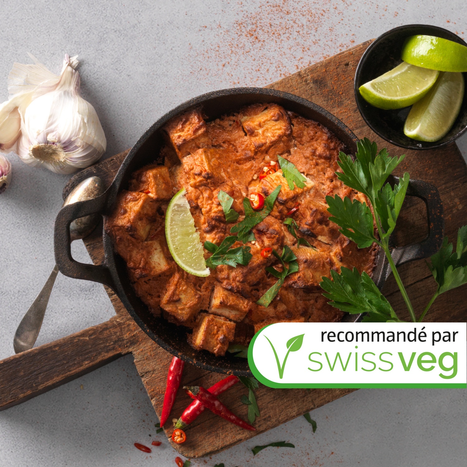 - Éplucher et râper finement l’ail et le gingembre pour la marinade. Couper les piments en deux, enlever les graines puis couper en fines lamelles. Mélanger avec le yogourt au soja, la cannelle, le sel, les épices tandoori, le jus et le zeste de citron vert afin d’obtenir la marinade.