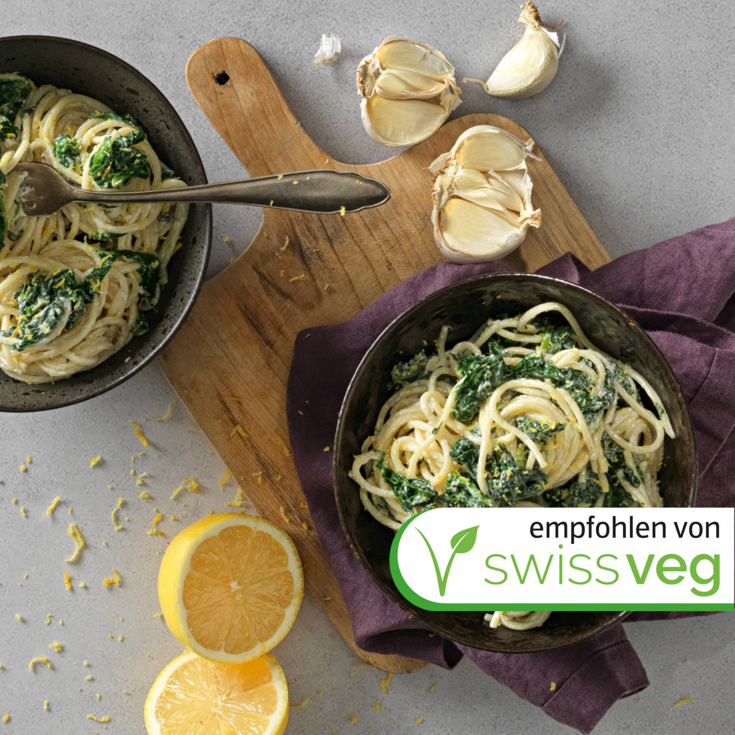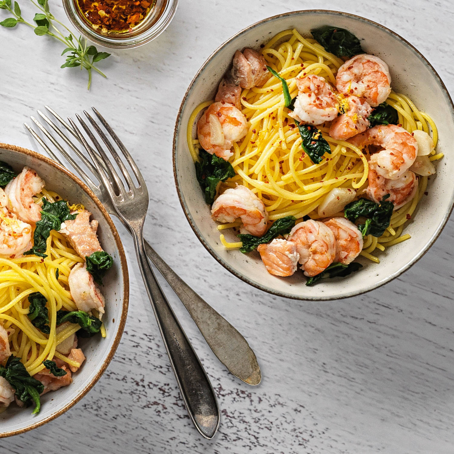 Spaghettis végans au citron avec des épinards en branches et du piment