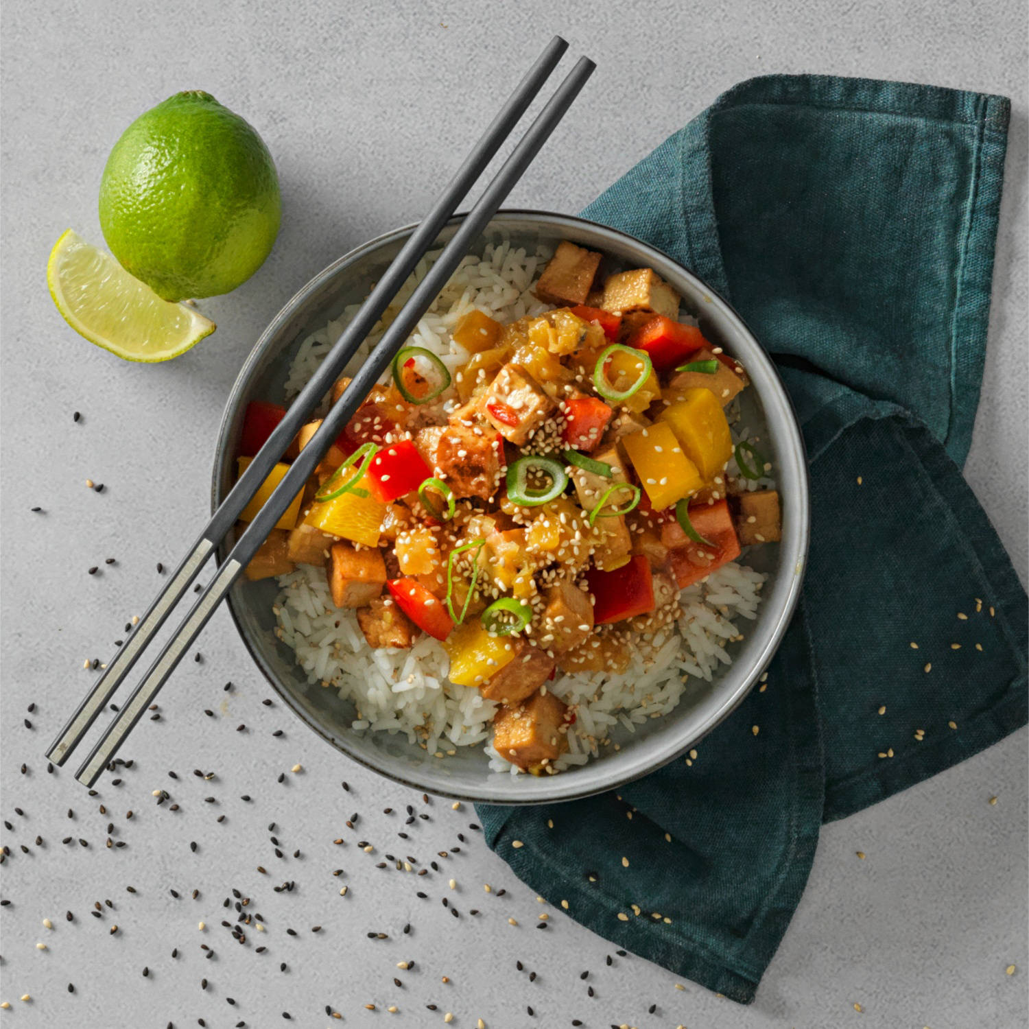 Tofu aigre-doux végan avec riz au jasmin