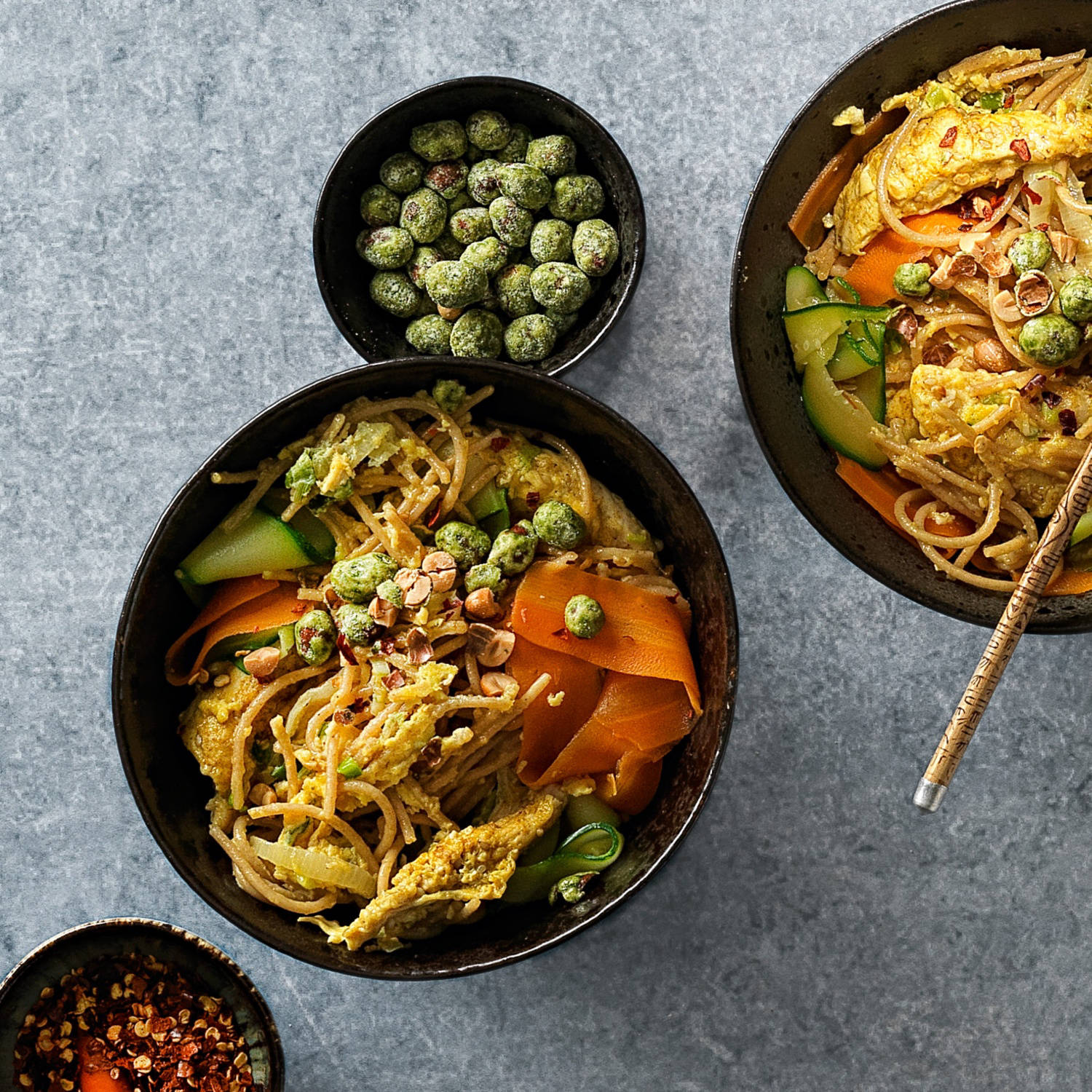 Spaghettis complets à la poêle avec poulet au curry et aux graines de sésame