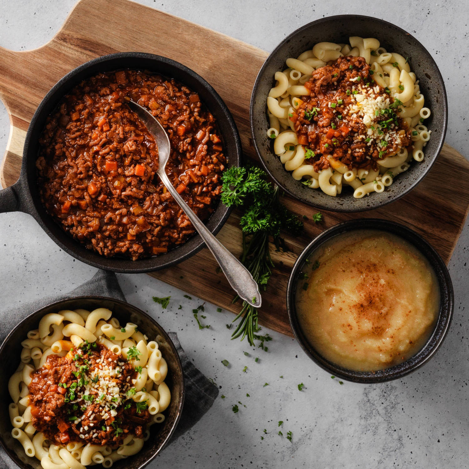 Viande hachée avec des cornettes et de la compote de pommes